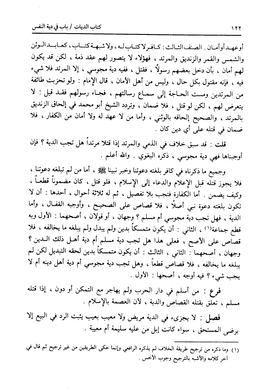 أو عهد أو أمان. الصنف الثالث: كافر لا كتاب له، ولا شبهة كتاب، كعابد الوثن والشمس والقمر والزنديق والمرتد، فهؤلاء لا يتصور لهم عقد ذمة، لكن قد يكون لهم أمان، بأن دخل بعضهم رسولا، فقتل، ففيه دية مجوسي، إلا المرتد فلا شئ فيه، فإنه مقتول بكل حال، وليس من أهل الامان، قال الامام: ولو تحزبت طائفة من المرتدين ومست الحاجة إلى سماع رسالتهم، فجاء رسولهم فقد قيل: لا يتعرض لهم، لكن لو قتل، فلا ضمان، وتردد الشيخ أبو محمد في إلحاق الزنديق بالمرتد، والصحيح إلحاقه بالوثني، وأما من لاعهد له ولا أمان من الكفار، فلا ضمان في قتله على أي دين كان. قلت: قد سبق خلاف في الذمي والمرتد إذا قتلا مرتدا هل تجب الدية ؟ فإن أوجبناها فهي دية مجوسي، ذكره البغوي. والله أعلم. وجميع ما ذكرناه في كافر بلغته دعوتنا وخبر نبينا - صلى الله عليه وسلم -، أما من لم تبلغه دعوتنا، فلا يجوز قتله قبل الاعلام والدعاء إلى الاسلام، فلو قتل، كان مضمونا قطعا، وكيف يضمن. أما الكفارة فتجب بلا تفصيل، ثم له ثلاثة أحوال، أحدها: أن لا تكون بلغته دعوة نبي أصلا، فلا قصاص على الصحيح، وأوجبه القفال، وأما الدية، فهل تجب دية مجوسي أم مسلم ؟ وجهان، أو قولان، أصحهما: الاول وبه قطع جماعة، الثاني: أن يكون متمسكا بدين ولم يبدل ولم يبلغه ما يخالفه، فلا قصاص على الاصح، فعلى هذا هل تجب دية مسلم أم دية أهل ذلك الدين ؟ وجهان، أصحهما: الثاني، الثالث: أن يكون متمسكا بدين لحقه التبديل لكن لم يبلغه ما يخالفه، فلا قصاص قطعا، وهل تجب دية مجوسي أم دية أهل دينه أم لا يجب شئ ؟ فيه أوجه، أصحها: الاول. فرع من أسلم في دار الحرب ولم يهاجر مع التمكن أو دون، إذا قتله مسلم، تعلق بقتله القصاص والدية، لان العصمة بالاسلام. فصل لا يجزئ في الدية مريض ولا معيب بعيب يثبت الرد في البيع إلا برضى المستحق، سواء كانت إبل من عليه سليمة أم معيبة.