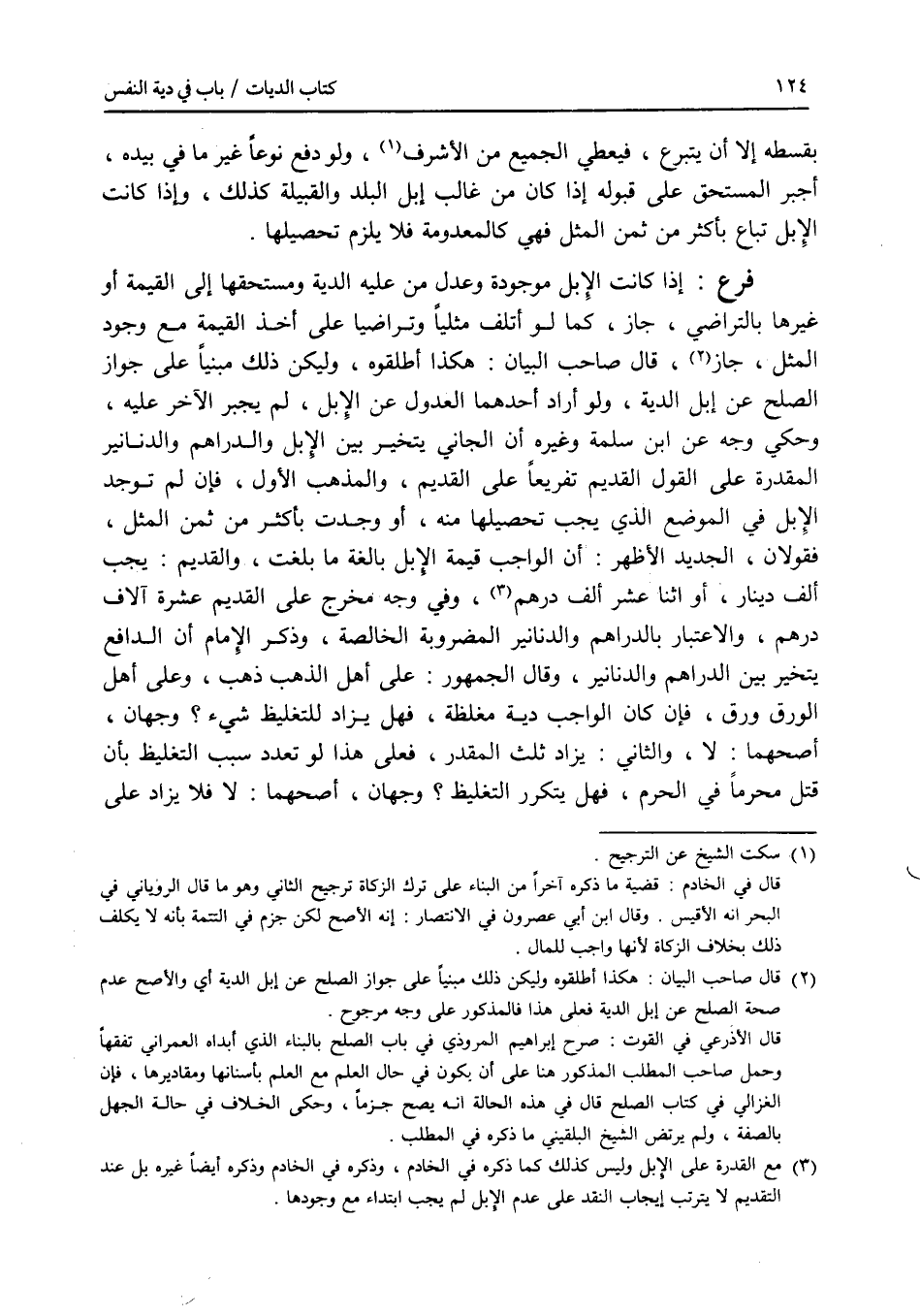 بقسطه إلا أن يتبرع، فيعطي الجميع من الاشرف، ولو دفع نوعا غير ما في بيده، أجبر المستحق على قبوله إذا كان من غالب إبل البلد والقبيلة كذلك، وإذا كانت الابل تباع بأكثر من ثمن المثل فهي كالمعدومة فلا يلزم تحصيلها. فرع إذا كانت الابل موجودة وعدل من عليه الدية ومستحقها إلى القيمة أو غيرها بالتراضي، جاز، كما لو أتلف مثليا وتراضيا على أخذ القيمة مع وجود المثل، جاز، قال صاحب البيان: هكذا أطلقوه، وليكن ذلك مبنيا على جواز الصلح عن إبل الدية، ولو أراد أحدهما العدول عن الابل، لم يجبر الآخر عليه، وحكي وجه عن ابن سلمة وغيره أن الجاني يتخير بين الابل والدراهم والدنانير المقدرة على القول القديم تفريعا على القديم، والمذهب الاول، فإن لم توجد الابل في الموضع الذي يجب تحصيلها منه، أو وجدت بأكثر من ثمن المثل، فقولان، الجديد الاظهر: أن الواجب قيمة الابل بالغة ما بلغت، والقديم: يجب ألف دينار، أو اثنا عشر ألف درهم، وفي وجه مخرج على القديم عشرة آلاف درهم، والاعتبار بالدراهم والدنانير المضروبة الخالصة، وذكر الامام أن الدافع يتخير بين الدراهم والدنانير، وقال الجمهور: على أهل الذهب ذهب، وعلى أهل الورق ورق، فإن كان الواجب دية مغلظة، فهل يزاد للتغليظ شئ ؟ وجهان، أصحهما: لا، والثاني: يزاد ثلث المقدر، فعلى هذا لو تعدد سبب التغليظ بأن قتل محرما في الحرم، فهل يتكرر التغليظ ؟ وجهان، أصحهما: لا فلا يزاد على