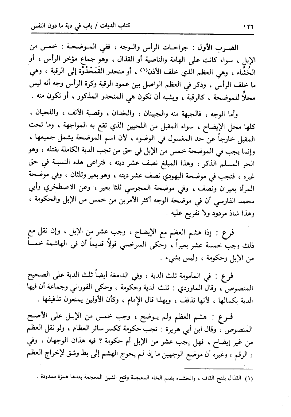 الضرب الاول: جراحات الرأس والوجه، ففي الموضحة: خمس من الابل، سواء كانت على الهامة والناصية أو القذال، وهو جماع مؤخر الرأس، أو الخشاء، وهي العظم الذي خلف الاذن، أو منحدر القمحدوة إلى الرقبة، وهي ما خلف الرأس، وذكر في العظم الواصل بين عمود الرقبة وكرة الرأس وجه أنه ليس محلا للموضحة، كالرقبة، ويشبه أن تكون هي المنحدر المذكور، أو تكون منه. وأما الوجه، فالجبهة منه والجبينان، والخدان، وقصبة الانف، واللحيان، كلها محل الايضاح، سواء المقبل من اللحيين الذي تقع به المواجهة، وما تحت المقبل خارجا عن حد المغسول في الوضوء، لان اسم الموضحة يشمل جميعها، وإنما يجب في الموضحة خمس من الابل في حق من تجب الدية الكاملة بقتله، وهو الحر المسلم الذكر، وهذا المبلغ نصف عشر ديته، فتراعى هذه النسبة في حق غيره، فتجب في موضحة اليهودي نصف عشر ديته، وهو بعير وثلثان، وفي موضحة المرأة بعيران ونصف، وفي موضحة المجوسي ثلثا بعير، وعن الاصطخري وأبي محمد الفارسي أن في موضحة الوجه أكثر الامرين من خمس من الابل والحكومة، وهذا شاذ مردود ولا تفريع عليه. فرع إذا هشم العظم مع الايضاح، وجب عشر من الابل، وإن نقل مع ذلك وجب خمسة عشر بعيرا، وحكى السرخسي قولا قديما أن في الهاشمة خمسا من الابل وحكومة، وليس بشئ. فرع في المأمومة ثلث الدية، وفي الدامغة أيضا ثلث الدية على الصحيح المنصوص، وقال الماوردي: ثلث الدية وحكومة، وحكى الفوراني وجماعة أن فيها الدية بكمالها، لانها تذفف، وبهذا قال الامام، وكأن الاولين يمنعون تذفيفها. فرع هشم العظم ولم يوضح، وجب خمس من الابل على الاصح المنصوص، وقال ابن أبي هريرة: تجب حكومة ككسر سائر العظام، ولو نقل العظم من غير إيضاح، فهل يجب عشر من الابل م حكومة ؟ فيه هذان الوجهان، وفي الرقم وغيره أن موضع الوجهين ما إذا لم يحوج الهشم إلى بط وشق لاخراج العظم