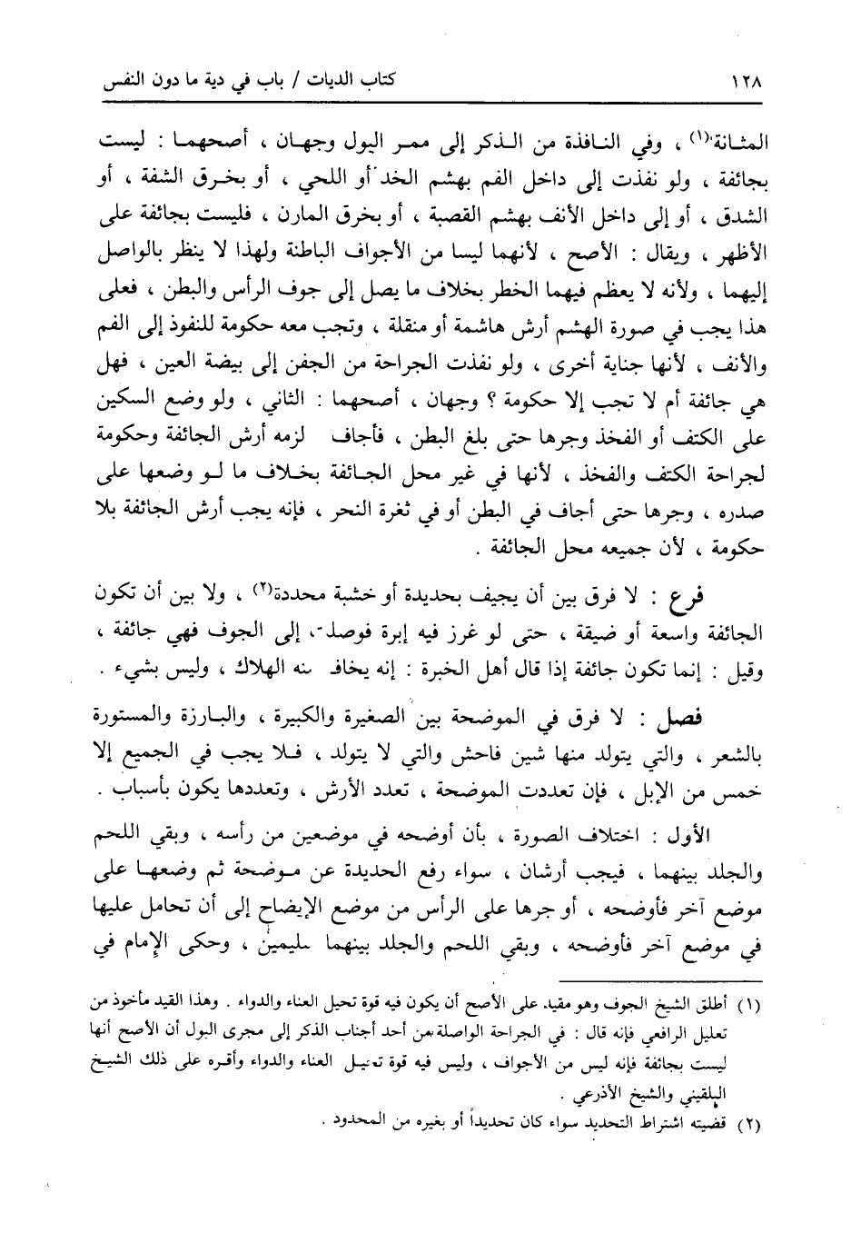 المثانة، وفي النافذة من الذكر إلى ممر البول وجهان، أصحهما: ليست بجائفة، ولو نفذت إلى داخل الفم بهشم الخد أو اللحي، أو بخرق الشفة، أو الشدق، أو إلى داخل الانف بهشم القصبة، أو بخرق المارن، فليست بجائفة على الاظهر، ويقال: الاصح، لانهما ليسا من الاجواف الباطنة ولهذا لا ينظر بالواصل إليهما، ولانه لا يعظم فيهما الخطر بخلاف ما يصل إلى جوف الرأس والبطن، فعلى هذا يجب في صورة الهشم أرش هاشمة أو منقلة، وتجب معه حكومة للنفوذ إلى الفم والانف، لانها جناية أخرى، ولو نفذت الجراحة من الجفن إلى بيضة العين، فهل هي جائفة أم لا تجب إلا حكومة ؟ وجهان، أصحهما: الثاني، ولو وضع السكين على الكتف أو الفخذ وجرها حتى بلغ البطن، فأجاف، لزمه أرش الجائفة وحكومة لجراحة الكتف والفخذ، لانها في غير محل الجائفة بخلاف ما لو وضعها على صدره، وجرها حتى أجاف في البطن أو في ثغرة النحر، فإنه يجب أرش الجائفة بلا حكومة، لان جميعه محل الجائفة. فرع لا فرق بين أن يجيف بحديدة أو خشبة محددة، ولا بين أن تكون الجائفة واسعة أو ضيقة، حتى لو غرز فيه إبرة فوصلت إلى الجوف فهي جائفة، وقيل: إنما تكون جائفة إذا قال أهل الخبرة: إنه يخاف منه الهلاك، وليس بشئ. فصل لا فرق في الموضحة بين الصغيرة والكبيرة، والبارزة والمستورة بالشعر، والتي يتولد منها شين فاحش والتي لا يتولد، فلا يجب في الجميع إلا خمس من الابل، فإن تعددت الموضحة، تعدد الارش، وتعددها يكون بأسباب. الاول: اختلاف الصورة، بأن أوضحه في موضعين من رأسه، وبقي اللحم والجلد بينهما، فيجب أرشان، سواء رفع الحديدة عن موضحة ثم وضعها على موضع آخر فأوضحه، أو جرها على الرأس من موضع الايضاح إلى أن تحامل عليها في موضع آخر فأوضحه، وبقي اللحم والجلد بينهما سليمين، وحكى الامام في