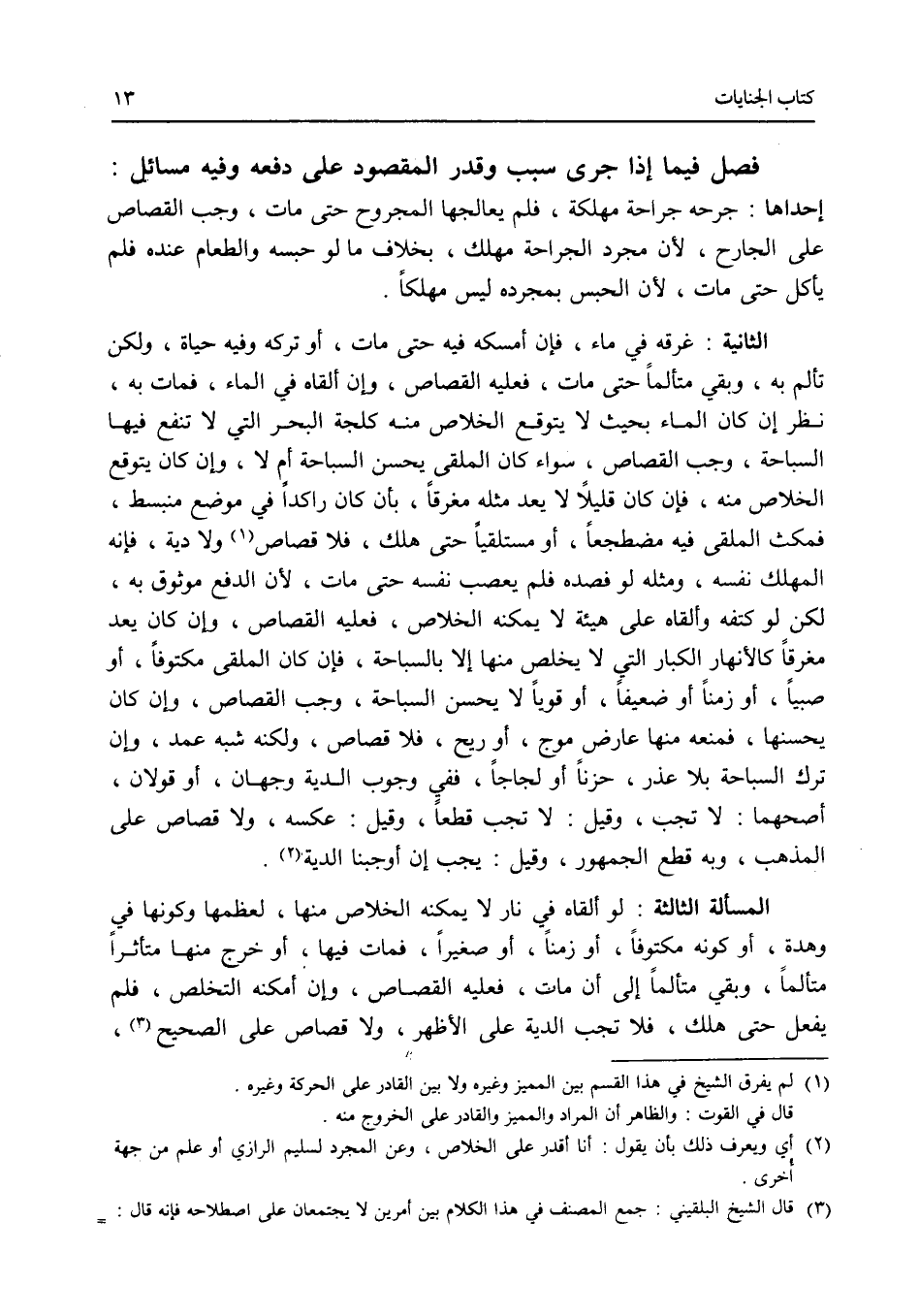 فصل فيما إذا جرى سبب وقدر المقصود على دفعه وفيه مسائل: إحداها: جرحه جراحة مهلكة، فلم يعالجها المجروح حتى مات، وجب القصاص على الجارح، لان مجرد الجراحة مهلك، بخلاف ما لو حبسه والطعام عنده فلم يأكل حتى مات، لان الحبس بمجرده ليس مهلكا. الثانية: غرقه في ماء، فإن أمسكه فيه حتى مات، أو تركه وفيه حياة، ولكن تألم به، وبقي متألما حتى مات، فعليه القصاص، وإن ألقاه في الماء، فمات به، نظر إن كان الماء بحيث لا يتوقع الخلاص منه كلجة البحر التي لا تنفع فيها السباحة، وجب القصاص، سواء كان الملقى يحسن السباحة أم لا، وإن كان يتوقع الخلاص منه، فإن كان قليلا لا يعد مثله مغرقا، بأن كان راكدا في موضع منبسط، فمكث الملقى فيه مضطجعا، أو مستلقيا حتى هلك، فلا قصاص ولا دية، فإنه المهلك نفسه، ومثله لو فصده فلم يعصب نفسه حتى مات، لان الدفع موثوق به، لكن لو كتفه وألقاه على هيئة لا يمكنه الخلاص، فعليه القصاص، وإن كان يعد مغرقا كالانهار الكبار التي لا يخلص منها إلا بالسباحة، فإن كان الملقى مكتوفا، أو صبيا، أو زمنا، أو ضعيفا، أو قويا لا يحسن السباحة، وجب القصاص، وإن كان يحسنها، فمنعه منها عارض موج، أو ريح، فلا قصاص، ولكنه شبه عمد، وإن ترك السباحة بلا عذر، حزنا أو لجاجا، ففي وجوب الدية وجهان، أو قولان، أصحهما: لا تجب، وقيل: لا تجب قطعا، وقيل: عكسه، ولا قصاص على المذهب، وبه قطع الجمهور، وقيل: يجب إن أوجبنا الدية. المسألة الثالثة: لو ألقاه في نار لا يمكنه الخلاص منها، لعظمها أو كونها في وهدة، أو كونه مكتوفا، أو زمنا، أو صغيرا، فمات فيها، أو خرج منها متأثرا متألما، وبقي متألما إلى أن مات، فعليه القصاص، وإن أمكنه التخلص، فلم يفعل حتى هلك، فلا تجب الدية على الاظهر، ولا قصاص على الصحيح،
