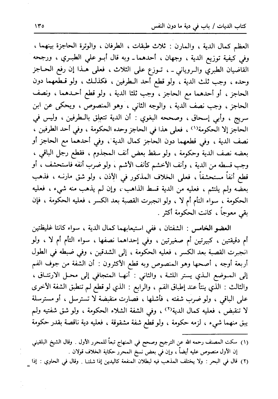 العظم كمال الدية، والمارن: ثلاث طبقات، الطرفان، والوترة الحاجزة بينهما، وفي كيفية توزيع الدية، وجهان، أحدهما - وبه قال أبو علي الطبري، ورجحه القاضيان الطبري والروياني -، توزع على الثلاث، فعلى هذا إن رفع الحاجز وحده، وجب ثلث الدية، ولو قطع أحد الطرفين، فكذلك، ولو قطعهما دون الحاجز، أو أحدهما مع الحاجز، وجب ثلثا الدية، ولو قطع أحدهما، ونصف الحاجز وجب نصف الدية، والوجه الثاني، وهو المنصوص، ويحكى عن ابن سريج، وأبي إسحاق، وصححه البغوي: أن الدية تتعلق بالطرفين، وليس في الحاجز إلا الحكومة، فعلى هذا في الحاجز وحده الحكومة، وفي أحد الطرفين، نصف الدية، وفي قطعهما دون الحاجز كمال الدية، وفي أحدهما مع الحاجز أو بعضه نصف الدية وحكومة، ولو سقط بعض أنف المجذوم، فقطع رجل الباقي، وجب قسطه من الدية، وأنف الاخشم كأنف الاشم، ولو ضرب أنفه فاستحشف، أو قطع أنفا مستحشفا، فعلى الخلاف المذكور في الاذن، ولو شق مارنه، فذهب بعضه ولم يلتئم، فعليه من الدية قسط الذاهب، وإن لم يذهب منه شئ، فعليه الحكومة، سواء التأم أم لا، ولو انجبرت القصبة بعد الكسر، فعليه الحكومة، فإن بقي معوجا، كانت الحكومة أكثر. العضو الخامس: الشفتان، ففي استيعابهما كمال الدية، سواء كانتا غليظتين أم دقيقتين، كبيرتين أم صغيرتين، وفي إحداهما نصفها، سواء التأم أم لا، ولو انجبرت القصبة بعد الكسر، فعليه الحكومة، إلى الشدقين، وفي ضبطه في الطول أربعة أوجه، أصحها وهو المنصوص وبه قطع الاكثرون: أن الشفة من جوف الفم إلى الموضع الذي يستر اللثة، والثاني: أنها المتجافي إلى محل الارتتاق، والثالث: الذي ينتأ عند إطباق الفم، والرابع: الذي لو قطع لم تنطبق الشفة الاخرى على الباقي، ولو ضرب شفته، فأشلها فصارت منقبضة لا تسترسل، أو مسترسلة لا تنقبض، فعليه كمال الدية، وفي الشفة الشلاء الحكومة، ولو شق شفتيه ولم يبق منهما شئ، لزمه حكومة، ولو قطع شفة مشقوقة، فعليه دية ناقصة بقدر حكومة