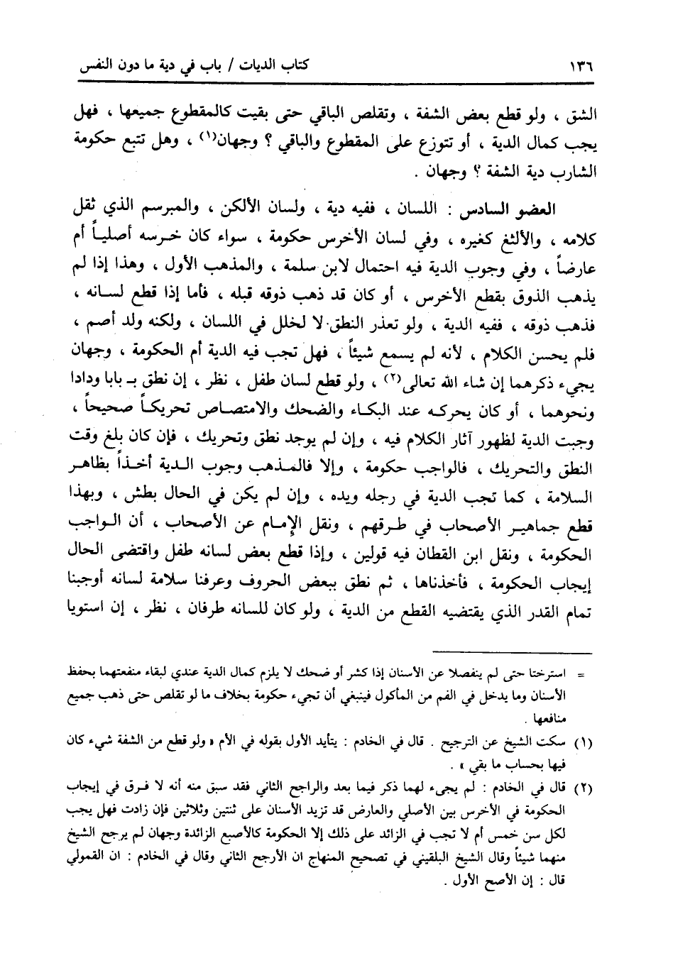 الشق، ولو قطع بعض الشفة، وتقلص الباقي حتى بقيت كالمقطوع جميعها، فهل يجب كمال الدية، أو تتوزع على المقطوع والباقي ؟ وجهان، وهل تتبع حكومة الشارب دية الشفة ؟ وجهان. العضو السادس: اللسان، ففيه دية، ولسان الالكن، والمبرسم الذي ثقل كلامه، والالثغ كغيره، وفي لسان الاخرس حكومة، سواء كان خرسه أصليا أم عارضا، وفي وجوب الدية فيه احتمال لابن سلمة، والمذهب الاول، وهذا إذا لم يذهب الذوق بقطع الاخرس، أو كان قد ذهب ذوقه قبله، فأما إذا قطع لسانه، فذهب ذوقه، ففيه الدية، ولو تعذر النطق لا لخلل في اللسان، ولكنه ولد أصم، فلم يحسن الكلام، لانه لم يسمع شيئا، فهل تجب فيه الدية أم الحكومة، وجهان يجئ ذكرهما إن شاء الله تعالى، ولو قطع لسان طفل، نظر، إن نطق ببابا ودادا ونحوهما، أو كان يحركه عند البكاء والضحك والامتصاص تحريكا صحيحا، وجبت الدية لظهور آثار الكلام فيه، وإن لم يوجد نطق وتحريك، فإن كان بلغ وقت النطق والتحريك، فالواجب حكومة، وإلا فالمذهب وجوب الدية أخذا بظاهر السلامة، كما تجب الدية في رجله ويده، وإن لم يكن في الحال بطش، وبهذا قطع جماهير الاصحاب في طرقهم، ونقل الامام عن الاصحاب، أن الواجب الحكومة، ونقل ابن القطان فيه قولين، وإذا قطع بعض لسانه طفل واقتضى الحال إيجاب الحكومة، فأخذناها، ثم نطق ببعض الحروف وعرفنا سلامة لسانه أوجبنا تمام القدر الذي يقتضيه القطع من الدية، ولو كان للسانه طرفان، نظر، إن استويا