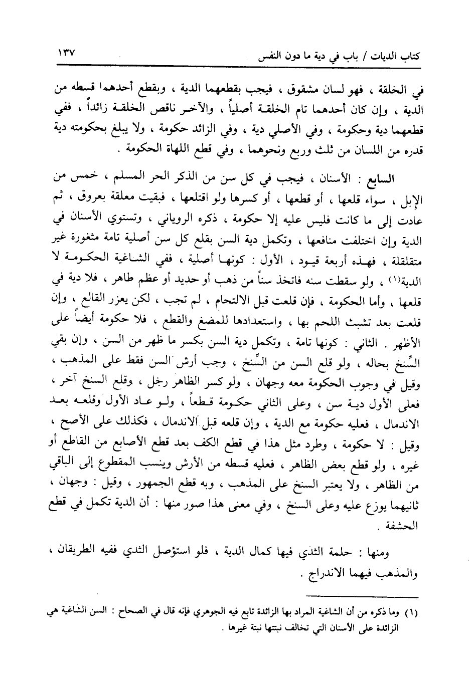في الخلقة، فهو لسان مشقوق، فيجب بقطعهما الدية، وبقطع أحدهما قسطه من الدية، وإن كان أحدهما تام الخلقة أصليا، والآخر ناقص الخلقة زائدا، ففي قطعهما دية وحكومة، وفي الاصلي دية، وفي الزائد حكومة، ولا يبلغ بحكومته دية قدره من اللسان من ثلث وربع ونحوهما، وفي قطع اللهاة الحكومة. السابع: الاسنان، فيجب في كل سن من الذكر الحر المسلم، خمس من الابل، سواء قلعها، أو قطعها، أو كسرها ولو اقتلعها، فبقيت معلقة بعروق، ثم عادت إلى ما كانت فليس عليه إلا حكومة، ذكره الروياني، وتستوي الاسنان في الدية وإن اختلفت منافعها، وتكمل دية السن بقلع كل سن أصلية تامة مثغورة غير متقلقلة، فهذه أربعة قيود، الاول: كونها أصلية، ففي الشاغية الحكومة لا الدية، ولو سقطت سنه فاتخذ سنا من ذهب أو حديد أو عظم طاهر، فلا دية في قلعها، وأما الحكومة، فإن قلعت قبل الالتحام، لم تجب، لكن يعزر القالع، وإن قلعت بعد تشبث اللحم بها، واستعدادها للمضغ والقطع، فلا حكومة أيضا على الاظهر. الثاني: كونها تامة، وتكمل دية السن بكسر ما ظهر من السن، وإن بقي السنخ بحاله، ولو قلع السن من السنخ، وجب أرش السن فقط على المذهب، وقيل في وجوب الحكومة معه وجهان، ولو كسر الظاهر رجل، وقلع السنخ آخر، فعلى الاول دية سن، وعلى الثاني حكومة قطعا، ولو عاد ا لاول وقلعه بعد الاندمال، فعليه حكومة مع الدية، وإن قلعه قبل الاندمال، فكذلك على الاصح، وقيل: لا حكومة، وطرد مثل هذا في قطع الكف بعد قطع الاصابع من القاطع أو غيره، ولو قطع بعض الظاهر، فعليه قسطه من الارش وينسب المقطوع إلى الباقي من الظاهر، ولا يعتبر السنخ على المذهب، وبه قطع الجمهور، وقيل: وجهان، ثانيهما يوزع عليه وعلى السنخ، وفي معنى هذا صور منها: أن الدية تكمل في قطع الحشفة. ومنها: حلمة الثدي فيها كمال الدية، فلو استؤصل الثدي ففيه الطريقان، والمذهب فيهما الاندراج.