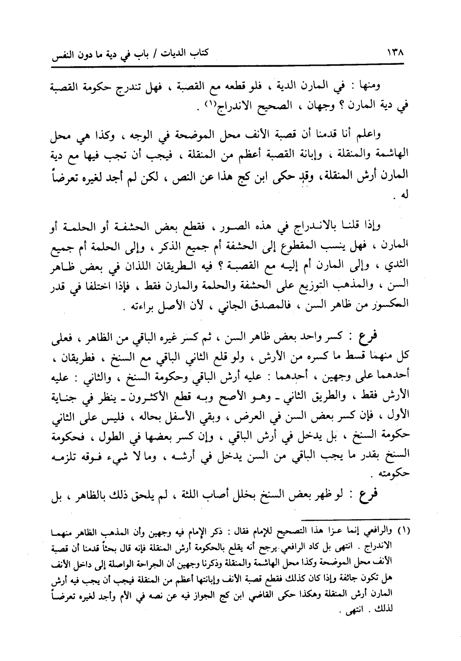 ومنها: في المارن الدية، فلو قطعه مع القصبة، فهل تندرج حكومة القصبة في دية المارن ؟ وجهان، الصحيح الاندراج. واعلم أنا قدمنا أن قصبة الانف محل الموضحة في الوجه، وكذا هي محل الهاشمة والمنقلة، وإبانة القصبة أعظم من المنقلة، فيجب أن تجب فيها مع دية المارن أرش المنقلة، وقد حكى ابن كج هذا عن النص، لكن لم أجد لغيره تعرضا له. وإذا قلنا بالاندراج في هذه الصور، فقطع بعض الحشفة أو الحلمة أو المارن، فهل ينسب المقطوع إلى الحشفة أم جميع الذكر، وإلى الحلمة أم جميع الثدي، وإلى المارن أم إليه مع القصبة ؟ فيه الطريقان اللذان في بعض ظاهر السن، والمذهب التوزيع على الحشفة والحلمة والمارن فقط، فإذا اختلفا في قدر المكسور من ظاهر السن، فالمصدق الجاني، لان الاصل براءته. فرع كسر واحد بعض ظاهر السن، ثم كسر غيره الباقي من الظاهر، فعلى كل منهما قسط ما كسره من الارش، ولو قلع الثاني الباقي مع السنخ، فطريقان، أحدهما على وجهين، أحدهما: عليه أرش الباقي وحكومة السنخ، والثاني: عليه الارش فقط، والطريق الثاني - وهو الاصح وبه قطع الاكثرون - ينظر في جناية الاول، فإن كسر بعض السن في العرض، وبقي الاسفل بحاله، فليس على الثاني حكومة السنخ، بل يدخل في أرش الباقي، وإن كسر بعضها في الطول، فحكومة السنخ بقدر ما يجب الباقي من السن يدخل في أرشه، وما لا شئ فوقه تلزمه حكومته. فرع لو ظهر بعض السنخ بخلل أصاب اللثة، لم يلحق ذلك بالظاهر، بل