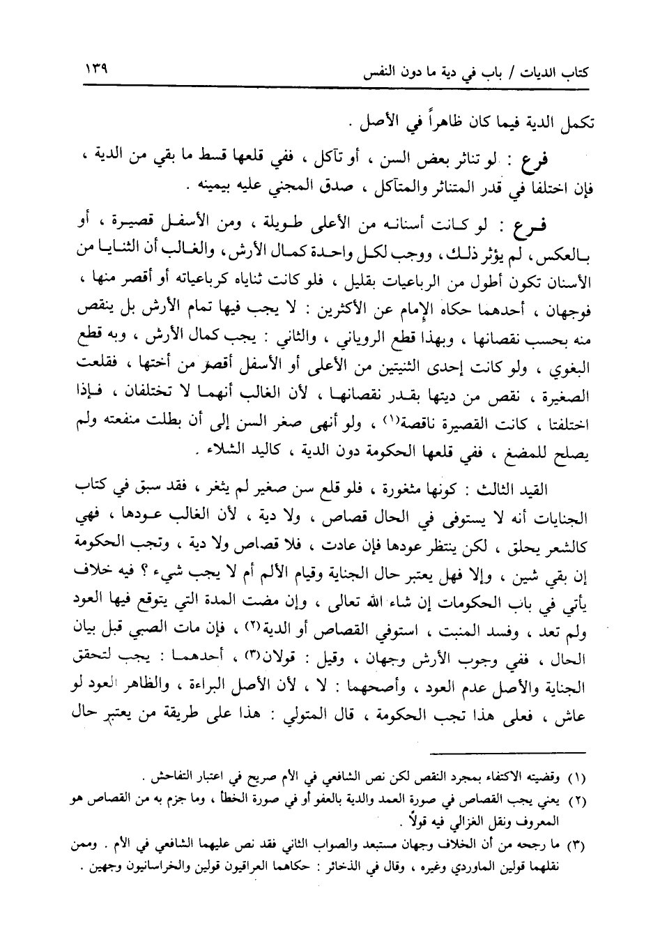 تكمل الدية فيما كان ظاهرا في الاصل. فرع لو تناثر بعض السن، أو تآكل، ففي قلعها قسط ما بقي من الدية، فإن اختلفا في قدر المتناثر والمتآكل، صدق المجني عليه بيمينه. فرع لو كانت أسنانه من الاعلى طويلة، ومن الاسفل قصيرة، أو بالعكس، لم يؤثر ذلك، ووجب لكل واحدة كمال الارش، والغالب أن الثنايا من الاسنان تكون أطول من الرباعيات بقليل، فلو كانت ثناياه كرباعياته أو أقصر منها، فوجهان، أحدهما حكاه الامام عن الاكثرين: لا يجب فيها تمام الارش بل ينقص منه بحسب نقصانها، وبهذا قطع الروياني، والثاني: يجب كمال الارش، وبه قطع البغوي، ولو كانت إحدى الثنيتين من الاعلى أو الاسفل أقصر من أختها، فقلعت الصغيرة، نقص من ديتها بقدر نقصانها، لان الغالب أنهما لا تختلفان، فإذا اختلفتا، كانت القصيرة ناقصة، ولو أنهى صغر السن إلى أن بطلت منفعته ولم يصلح للمضغ، ففي قلعها الحكومة دون الدية، كاليد الشلاء. القيد الثالث: كونها مثغورة، فلو قلع سن صغير لم يثغر، فقد سبق في كتاب الجنايات أنه لا يستوفى في الحال قصاص ولا دية، لان الغالب عودها، فهي كالشعر يحلق، لكن ينتظر عودها فإن عادت، فلا قصاص ولا دية، وتجب الحكومة إن بقي شين، وإلا فهل يعتبر حال الجناية وقيام الالم أم لا يجب شئ ؟ فيه خلاف يأتي في باب الحكومات إن شاء الله تعالى، وإن مضت المدة التي يتوقع فيها العود ولم تعد، وفسد المنبت، استوفي القصاص أو الدية، فإن مات الصبي قبل بيان الحال، ففي وجوب الارش وجهان، وقيل: قولان، أحدهما: يجب لتحقق الجناية والاصل عدم العود، وأصحهما: لا، لان الاصل البراءة، والظاهر العود لو عاش، فعلى هذا تجب الحكومة، قال المتولي: هذا على طريقة من يعتبر حال