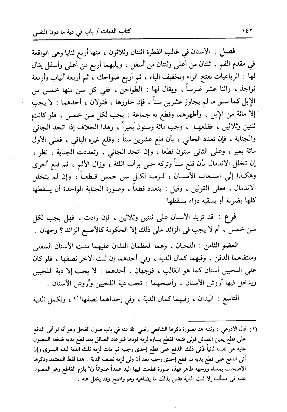 فصل الاسنان في غالب الفطرة اثنتان وثلاثون، منها أربع ثنايا وهي الواقعة في مقدم الفم، ثنتان من أعلى وثنتان من أسفل، ويليهما أربع من أعلى وأسفل يقال لها: الرباعيات بفتح الراء وتخفيف الباء، ثم أربع ضواحك، ثم أربعة أنياب وأربعة نواجذ، واثنا عشر ضرسا، ويقال لها: الطواحن، ففي كل سن منها خمس من الابل كما سبق ما لم يجاوز عشرين سنا، فإن جاوزها، فقولان، أحدهما: لا يجب إلا مائة من الابل، وأظهرهما وقطع به جماعة: يجب لكل سن خمس، فلو كانت ثنتين وثلاثين، فقلعها، وجب مائة وستون بعيرا، وهذا الخلاف إذا اتحد الجاني والجناية، فإن تعدد الجاني، بأن قلع عشرين سنا، وقلع غيره الباقي، فعلى الاول مائة بعير، وعلى الثاني ستون قطعا، وإن اتحد الجاني، وتعددت الجناية، نظر، إن تخلل الاندمال بأن قلع سنا وتركه حتى برأت اللثة، وزال الالم، ثم قلع أخرى وهكذا إلى استيعاب الاسنان، لزمه لكل سن خمس قطعا، وإن لم يتخلل الاندمال، فعلى القولين، وقيل: يتعدد قطعا، وصورة الجناية الواحدة أن يسقطها كلها بضربة أو يسقيه دواء يسقطها. فرع قد تزيد الاسنان على ثنتين وثلاثين، فإن زادت، فهل يجب لكل سن خمس، أم لا يجب في الزائد على ذلك إلا الحكومة كالاصبع الزائد ؟ وجهان. العضو الثامن: اللحيان، وهما العظمان اللذان عليهما منبت الاسنان السفلى وملتقاهما الذقن، وفيهما كمال الدية، وفي أحدهما إن ثبت الآخر نصفها، فلو كان على اللحيين أسنان كما هو الغالب، فوجهان، أحدهما: لا يجب إلا دية اللحيين ويدخل فيها أروش الاسنان، وأصحهما: تجب دية اللحيين وأروش الاسنان. التاسع: اليدان، وفيهما كمال الدية، وفي إحداهما نصفها، وتكمل الدية