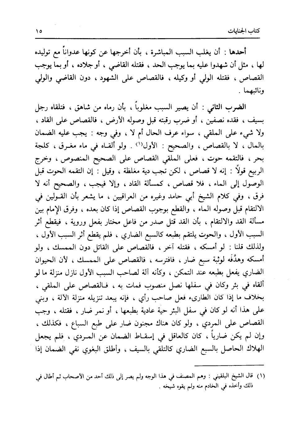 أحدها: أن يغلب السبب المباشرة، بأن أخرجها عن كونها عدوانا مع توليده لها، مثل أن شهدوا عليه بما يوجب الحد، فقتله القاضي، أو جلاده، أو بما يوجب القصاص، فقتله الولي أو وكيله، فالقصاص على الشهود، دون القاضي والولي ونائبهما. الضرب الثاني: أن يصير السبب مغلوبا، بأن رماه من شاهق، فتلقاه رجل بسيف، فقده نصفين، أو ضرب رقبته قبل وصوله الارض، فالقصاص على القاد، ولا شئ على الملقي، سواء عرف الحال أم لا، وفي وجه: يجب عليه الضمان بالمال، لا بالقصاص، والصحيح: الاول. ولو ألقاه في ماء مغرق، كلجة بحر، فالتقمه حوت، فعلى الملقي القصاص على الصحيح المنصوص، وخرج الربيع قولا: إنه لا قصاص، لكن تجب دية مغلظة، وقيل: إن التقمه الحوت قبل الوصول إلى الماء، فلا قصاص، كمسألة القاد، وإلا فيجب، والصحيح أنه لا فرق، وفي كلام الشيخ أبي حامد وغيره من العراقيين، ما يشعر بأن القولين في الالتقام قبل وصوله الماء، والقطع بوجوب القصاص إذا كان بعده، وفرق الامام بين مسألة القد والالتقام، بأن القد قتل صدر من فاعل مختار بفعل وروية، فيقطع أثر السبب الاول، والحوت يلتقم بطبعه كالسبع الضاري، فلم يقطع أثر السبب الاول، ولذلك قلنا: لو أمسكه، فقتله آخر، فالقصاص على القاتل دون الممسك، ولو أمسكه وهدفه لوثبة سبع ضار، فافترسه، فالقصاص على الممسك، لان الحيوان الضاري يفعل بطبعه عند التمكن، وكأنه آلة لصاحب السبب الاول نازل منزلة ما لو ألقاه في بئر وكان في سفلها نصل منصوب فمات به، فالقصاص على الملقي، بخلاف ما إذا كان الطارئ فعل صاحب رأي، فإنه يبعد تنزيله منزلة الآلة، وبني على هذا أنه لو كان في سفل البئر حية عادية بطبعها، أو نمر ضار، فقتله، وجب القصاص على المردي، ولو كان هناك مجنون ضار على طبع السباع، فكذلك، وإن لم يكن ضاريا، كان كالعاقل في إسقاط الضمان عن المردي، فلم يجعل الهلاك الحاصل بالسبع الضاري كالتلقي بالسيف، وأطلق البغوي نفي الضمان إذا