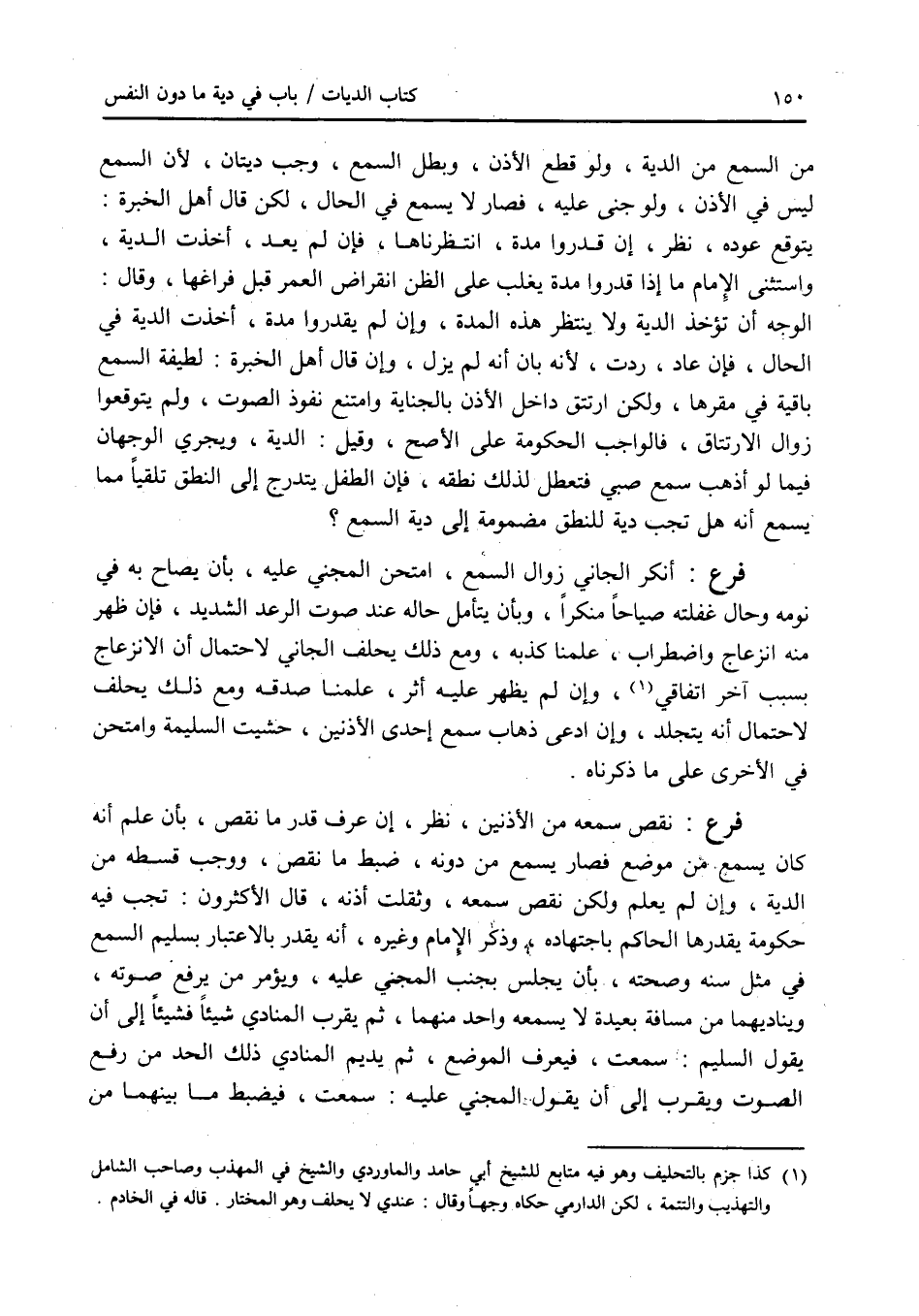 من السمع من الدية، ولو قطع الاذن، وبطل السمع، وجب ديتان، لان السمع ليس في الاذن، ولو جنى عليه، فصار لا يسمع في الحال، لكن قال أهل الخبرة: يتوقع عوده، نظر، إن قدروا مدة، انتظرناها، فإن لم يعد، أخذت الدية، واستثنى الامام ما إذا قدروا مدة يغلب على الظن انقراض العمر قبل فراغها، وقال: الوجه أن تؤخذ الدية ولا ينتظر هذه المدة، وإن لم يقدروا مدة: أخذت الدية في الحال، فإن عاد، ردت، لانه بان أنه لم يزل، وإن قال أهل الخبرة: لطيفة السمع باقية في مقرها، ولكن ارتتق داخل الاذن بالجناية وامتنع نفوذ الصوت، ولم يتوقعوا زوال الارتتاق، فالواجب الحكومة على الاصح، وقيل: الدية، ويجري الوجهان فيما لو أذهب سمع صبي فتعطل لذلك نطقه، فإن الطفل يتدرج إلى النطق تلقيا مما يسمع أنه هل تجب دية للنطق مضمومة إلى دية السمع ؟ فرع أنكر الجاني زوال السمع، امتحن المجني عليه، بأن يصاح به في نومه وحال غفلته صياحا منكرا، وبأن يتأمل حاله عند صوت الرعد الشديد، فإن ظهر منه انزعاج واضطراب، علمنا كذبه، ومع ذلك يحلف الجاني لاحتمال أن الانزعاج بسبب آخر اتفاقي، وإن لم يظهر عليه أثر، علمنا صدقه ومع ذلك يحلف لاحتمال أنه يتجلد، وإن ادعى ذهاب سمع إحدى الاذنين، حشيت السليمة وامتحن في الاخرى على ما ذكرناه. فرع نقص سمعه من الاذنين، نظر، إن عرف قدر ما نقص، بأن علم أنه كان يسمع من موضع فصار يسمع من دونه، ضبط ما نقص، ووجب قسطه من الدية، وإن لم يعلم ولكن نقص سمعه، وثقلت أذنه، قال الاكثرون: تجب فيه حكومة يقدرها الحاكم باجتهاده، وذكر الامام وغيره، أنه يقدر بالاعتبار بسليم السمع في مثل سنه وصحته، بأن يجلس بجنب المجني عليه، ويؤمر من يرفع صوته، ويناديهما من مسافة بعيدة لا يسمعه واحد منهما، ثم يقرب المنادي شيئا فشيئا إلى أن يقول السليم: سمعت، فيعرف الموضع، ثم يديم المنادي ذلك الحد من رفع الصوت ويقرب إلى أن يقول المجني عليه: سمعت، فيضبط ما بينهما من