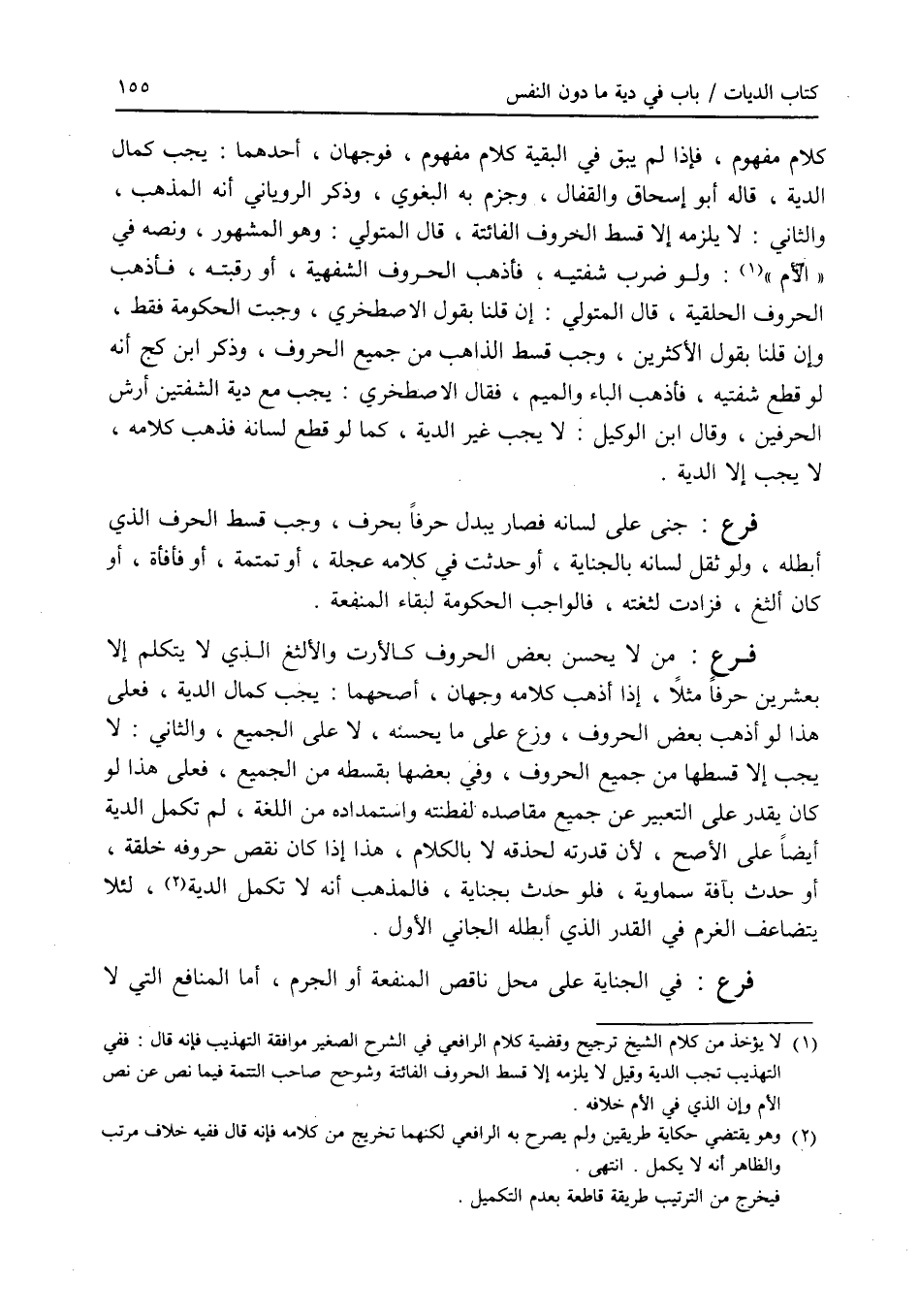 كلام مفهوم، فأما إذا لم يبق في البقية كلام مفهوم، فوجهان، أحدهما: يجب كمال الدية، قاله أبو إسحق والقفال، وجزم به البغوي، وذكر الروياني أنه المذهب، والثاني: لا يلزمه إلا قسط الحروف الفائتة، قال المتولي: وهو المشهور، ونصه في الام: ولو ضرب شفتيه، فأذهب الحروف الشفهية، أو رقبته، فأذهب الحروف الحلقية، قال المتولي: إن قلنا بقول الاصطخري، وجبت الحكومة فقط، وإن قلنا بقول الاكثرين، وجب قسط الذاهب من جميع الحروف، وذكر ابن كج أنه لو قطع شفتيه، فأذهب الباء والميم، فقال الاصطخري: يجب مع دية الشفتين أرش الحرفين، وقال ابن الوكيل: لا يجب غير الدية، كما لو قطع لسانه فذهب كلامه، لا يجب إلا الدية. فرع جنى على لسانه فصار يبدل حرفا بحرف، وجب قسط الحرف الذي أبطله، ولو ثقل لسانه بالجناية، أو حدثت في كلامه عجلة، أو تمتمة، أو فأفأة، أو كان ألثغ، فزادت لثغته، فالواجب الحكومة لبقاء المنفعة. فرع من لا يحسن بعض الحروف كالارت والالثغ الذي لا يتكلم إلا بعشرين حرفا مثلا، إذا أذهب كلامه وجهان، أصحهما: يجب كمال الدية، فعلى هذا لو أذهب بعض الحروف، وزع على ما يحسنه، لا على الجميع، والثاني: لا يجب إلا قسطها من جميع الحروف، وفي بعضها بقسطه من الجميع، فعلى هذا لو كان يقدر على التعبير عن جميع مقاصده لفطنته واستمداده من اللغة، لم تكمل الدية أيضا على الاصح، لان قدرته لحذقه لا بالكلام، هذا إذا كان نقص حروفه خلقة، أو حدث بآفة سماوية، فلو حدث بجناية، فالمذهب أنه لا تكمل الدية، لئلا يتضاعف الغرم في القدر الذي أبطله الجاني الاول. فرع في الجناية على محل ناقص المنفعة أو الجرم، أما المنافع التي لا