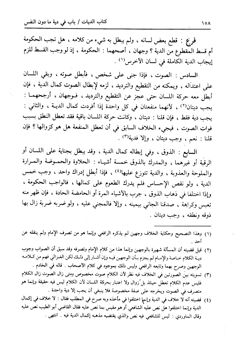 فرع قطع بعض لسانه، ولم يبطل به شئ من كلامه، هل تجب الحكومة أم قسط المقطوع من الدية ؟ وجهان، أصحهما: الحكومة، القسط للزم إيجاب الدية الكاملة في لسان الاخرس. السادس: الصوت، فإذا جنى على شخص، فأبطل صوته، وبقي اللسان على اعتداله، ويمكنه من التقطيع والترديد، لزمه لابطال الصوت كمال الدية، فإن أبطل معه حركة اللسان حتى عجز عن التقطيع والترديد، فوجهان، أرجحهما: يجب ديتان، لانهما منفعتان في كل واحدة إذا أفردت كمال الدية، والثاني: يجب دية فقط، فإن قلنا: ديتان، وكانت حركة اللسان باقية فقد تعطل النطق بسبب فوات الصوت، فيجئ الخلاف السابق في أن تعطل المنفعة هل هو كزوالها ؟ فإن قلنا: نعم، وجب ديتان، وإلا فدية. السابع: الذوق، وفي إبطاله كمال الدية، وقد يبطل بجناية على اللسان أو الرقبة أو غيرهما، والمدرك بالذوق خمسة أشياء: الحلاوة والحموضة والمرارة والملوحة والعذوبة، والدية تتوزع عليها، فإذا أبطل إدراك واحد، وجب خمس الدية، ولو نقص الاحساس فلم يدرك الطعوم على كمالها، فالواجب الحكومة، وإذا اختلفا في ذهاب الذوق، جرب بالاشياء المرة أو الحامضة الحادة، فإن ظهر منه تعبس وكراهة، صدقنا الجاني بيمينه، وإلا فالمجني عليه، ولو ضربه ضربة زال بها ذوقه ونطقه، وجب ديتان.