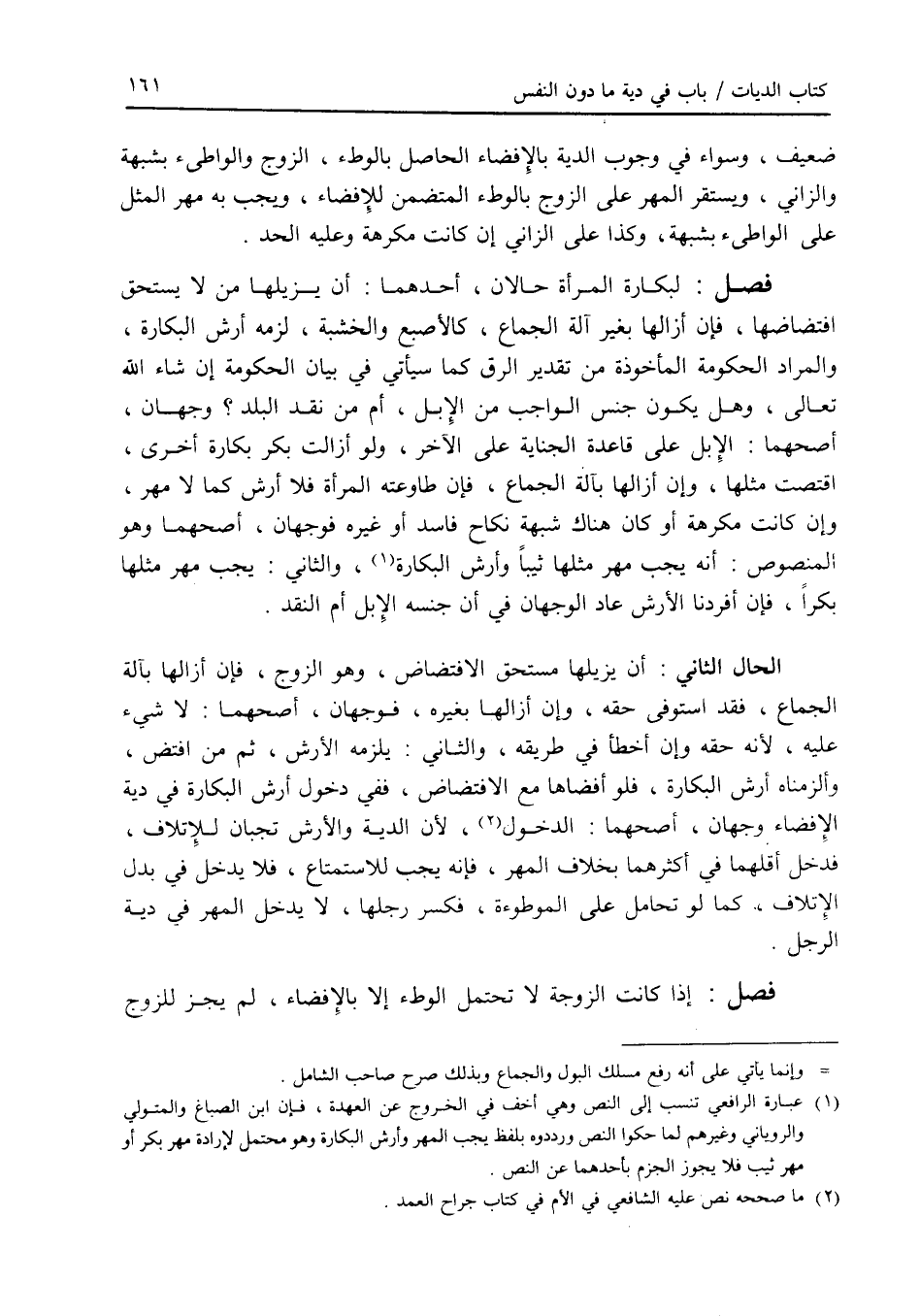 ضعيف، وسواء في وجوب الدية بالافضاء الحاصل بالوطئ، الزوج والواطئ بشبهة والزاني، ويستقر المهر على الزوج بالوطئ المتضمن للافضاء، ويجب به مهر المثل على الواطئ بشبهة، وكذا على الزاني إن كانت مكرهة وعليه الحد. فصل لبكارة المرأة حالان، أحدهما: أن يزيلها من لا يستحق افتضاضها، فإن أزالها بغير آلة الجماع، كالاصبع والخشبة، لزمه أرش البكارة، والمراد الحكومة المأخوذة من تقدير الرق كما سيأتي في بيان الحكومة إن شاء الله تعالى، وهل يكون جنس الواجب من الابل، أم من نقد البلد ؟ وجهان، أصحهما: الابل على قاعدة الجناية على الاحرار، ولو أزالت بكر بكارة أخرى، اقتصت منها، وإن أزالها بآلة الجماع، فإن طاوعته المرأة فلا أرش كما لا مهر، وإن كانت مكرهة أو كان هناك شبهة نكاح فاسد أو غيره فوجهان، أصحهما وهو المنصوص: أنه يجب مهر مثلها ثيبا وأرش البكارة، والثاني: يجب مهر مثلها بكرا، فإن أفردنا الارش عاد الوجهان في أن جنسه الابل أم النقد. الحال الثاني: أن يزيلها مستحق الافتضاض، وهو الزوج، فإن أزالها بآلة الجماع، فقد استوفى حقه، وإن أزالها بغيره، فوجهان، أصحهما: لا شئ عليه، لانه حقه وإن أخطأ في طريقه، والثاني: يلزمه الارش، ثم من افتض، وألزمناه أرش البكارة، فلو أفضاها مع الافتضاض، ففي دخول أرش البكارة في دية الافضاء وجهان، أصحهما: الدخول، لان الدية والارش تجبان للاتلاف، فدخل أقلهما في أكثرهما بخلاف المهر، فإنه يجب للاستمتاع، فلا يدخل في بدل الاتلاف، كما لو تحامل على الموطوءة، فكسر رجلها، لا يدخل المهر في دية الرجل. فصل إذا كانت الزوجة لا تحتمل الوطئ إلا بالافضاء، لم يجز للزوج