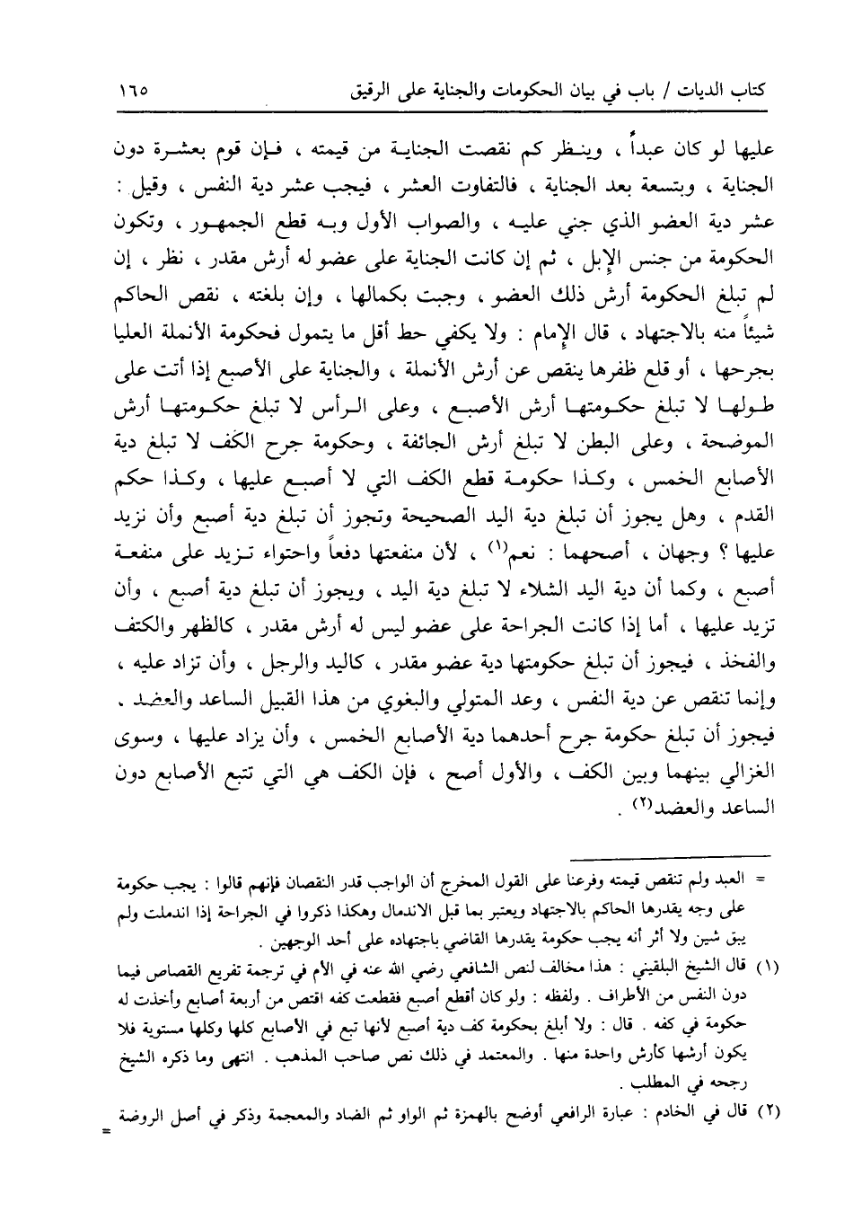 عليها لو كان عبدا، وينظر كم نقصت الجناية من قيمته، فإن قوم بعشرة دون الجناية، وبتسعة بعد الجناية، فالتفاوت العشر، فيجب عشر دية النفس، وقيل: عشر دية العضو الذي جني عليه، والصواب الاول وبه قطع الجمهور، وتكون الحكومة من جنس الابل، ثم إن كانت الجناية على عضو له أرش مقدر، نظر، إن لم تبلغ الحكومة أرش ذلك العضو، وجبت بكمالها، وإن بلغته، نقص الحاكم شيئا منه بالاجتهاد، قال الامام: ولا يكفي حط أقل ما يتمول فحكومة الانملة العليا بجرحها، أو قلع ظفرها ينقص عن أرش الانملة، والجناية على الاصبع إذا أتت على طولها لا تبلغ حكومتها أرش الاصبع، وعلى الرأس لا تبلغ حكومتها أرش الموضحة، وعلى البطن لا تبلغ أرش الجائفة، وحكومة جرح الكف لا تبلغ دية الاصابع الخمس، وكذا حكومة قطع الكف التي لا أصبع عليها، وكذا حكم القدم، وهل يجوز أن تبلغ دية اليد، الصحيحة ويجوز أن تبلغ دية أصبع، وأن نزيد عليها ؟ وجهان: أصحهما: نعم، لان منفعتها دفعا واحتواء تزيد على منفعة أصبع، وكما أن دية اليد الشلاء لا تبلغ دية اليد، ويجوز أن تبلغ دية أصبع، وأن تزيد عليها، أما إذا كانت الجراحة على عضو ليس له أرش مقدر، كالظهر والكتف والفخذ، فيجوز أن تبلغ حكومتها دية عضو مقدر، كاليد والرجل، وأن تزاد عليه، وإنما تنقص عن دية النفس، وعد المتولي والبغوي من هذا القبيل الساعد والعضد، فيجوز أن تبلغ حكومة جرح أحدهما دية الاصابع الخمس، وأن يزاد عليها، وسوى الغزالي بينهما وبين الكف، والاول أصح، فإن الكف هي التي تتبع الاصابع دون الساعد والعضد.