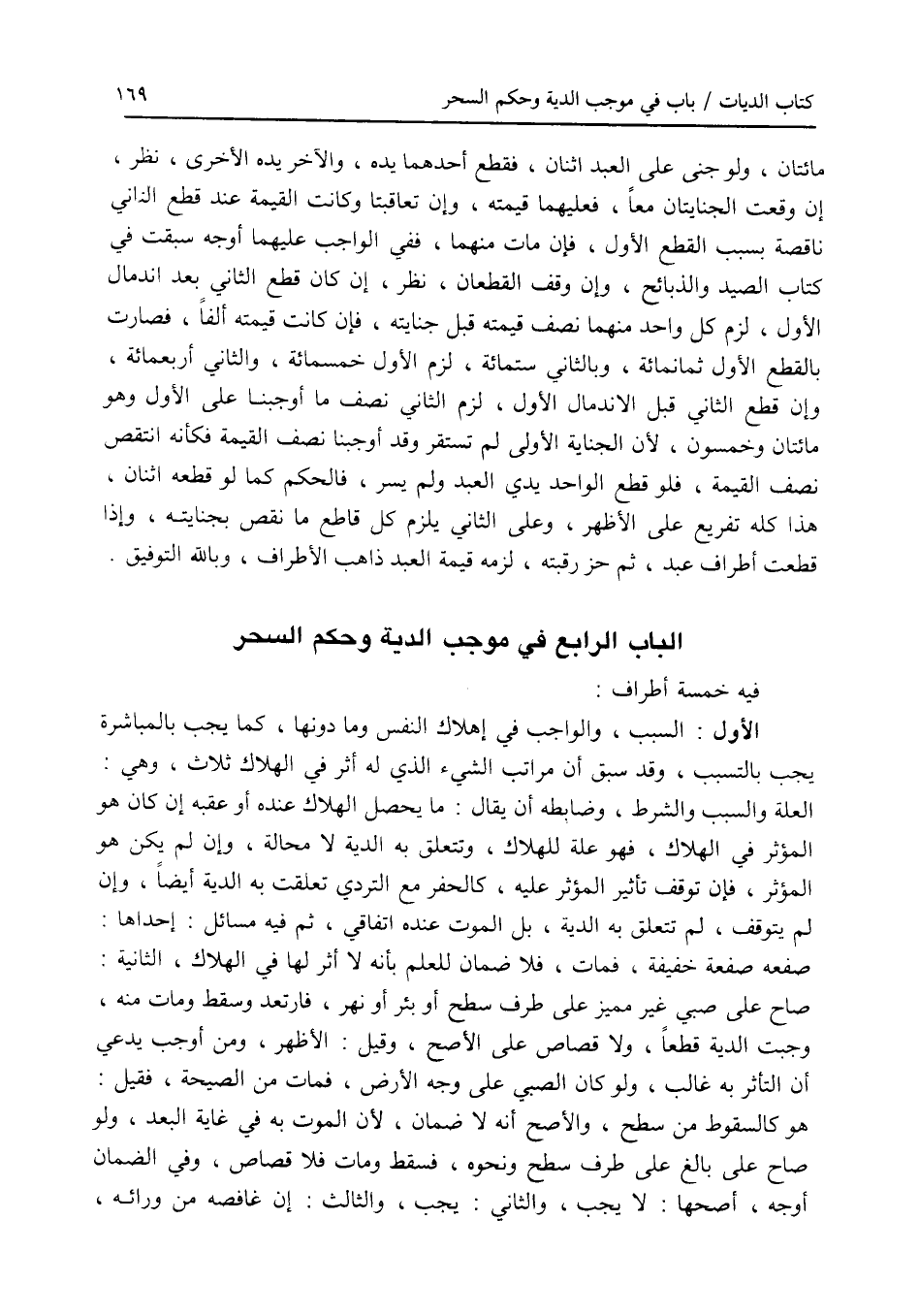 مائتان، ولو جنى على العبد اثنان، فقطع أحدهما يده، والآخر يده الاخرى، نظر، إن وقعت الجنايتان معا، فعليهما قيمته، وإن تعاقبتا وكانت القيمة عند قطع الثاني ناقصة بسبب القطع الاول، فإن مات منهما، ففي الواجب عليهما أوجه سبقت في كتاب الصيد والذبائح، وإن وقف القطعان، نظر، إن كان قطع الثاني بعد اندمال الاول، لزم كل واحد منهما نصف قيمته قبل جنايته، فإن كانت قيمته ألفا، فصارت بالقطع الاول ثمانمائة، وبالثاني ستمائة، لزم الاول خمسمائة، والثاني أربعمائة، وإن قطع الثاني قبل الاندمال الاول، لزم الثاني نصف ما أوجبنا على الاول وهو مائتان وخمسون، لان الجناية الاولى لم تستقر وقد أوجبنا نصف القيمة فكأنه انتقص نصف القيمة، فلو قطع الواحد يدي العبد ولم يسر، فالحكم كما لو قطعه اثنان، هذا كله تفريع على الاظهر، وعلى الثاني يلزم كل قاطع ما نقص بجنايته، وإذا قطعت أطراف عبد، ثم حز رقبته، لزمه قيمة العبد ذاهب الاطراف، وبالله التوفيق. الباب الرابع في موجب الدية وحكم السحر فيه خمسة أطراف: الاول: السبب، والواجب في إهلاك النفس وما دونها، كما يجب بالمباشرة يجب بالتسبب، وقد سبق أن مراتب الشئ الذي له أثر في الهلاك ثلاث، وهي: العلة والسبب والشرط، وضابطه أن يقال: ما يحصل الهلاك عنده أو عقبه إن كان هو المؤثر في الهلاك، فهو علة للهلاك، وتتعلق به الدية لا محالة، وإن لم يكن هو المؤثر، فإن توقف تأثير المؤثر عليه، كالحفر مع التردي تعلقت به الدية أيضا، وإن لم يتوقف، لم تتعلق به الدية، بل الموت عنده اتفاقي، ثم فيه مسائل: إحداها: صفعه صفعة خفيفة، فمات، فلا ضمان للعلم بأنه لا أثر لها في الهلاك، الثانية: صاح على صبي غير مميز على طرف سطح أو بئر أو نهر، فارتعد وسقط ومات منه، وجبت الدية قطعا، ولا قصاص على الاصح، وقيل: الاظهر، ومن أوجب يدعي أن التأثر به غالب، ولو كان الصبي على وجه الارض، فمات من الصيحة، فقيل: هو كالسقوط من سطح، والاصح أنه لا ضمان، لان الموت به في غاية البعد، ولو صاح على بالغ على طرف سطح ونحوه، فسقط ومات فلا قصاص، وفي الضمان أوجه، أصحها: لا يجب، والثاني: يجب، والثالث: إن غافصه من ورائه،