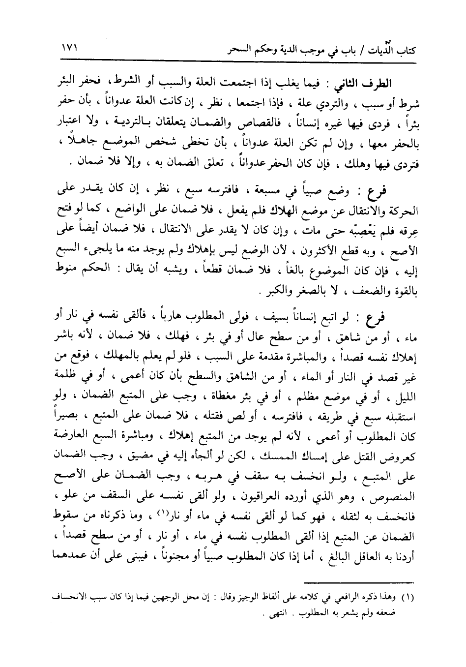 الطرف الثاني: فيما يغلب إذا اجتمعت العلة والسبب أو الشرط، فحفر البئر شرط أو سبب، والتردي علة، فإذا اجتمعا، نظر، إن كانت العلة عدوانا، بأن حفر بئرا، فردي فيها غيره إنسانا، فالقصاص والضمان يتعلقان بالتردية، ولا اعتبار بالحفر معها، وإن لم تكن العلة عدوانا، بأن تخطى شخص الموضع جاهلا، فتردى فيها وهلك، فإن كان الحفر عدوانا، تعلق الضمان به، وإلا فلا ضمان. فرع وضع صبيا في مسبعة، فافترسه سبع، نظر، إن كان يقدر على الحركة والانتقال عن موضع الهلاك فلم يفعل، فلا ضمان على الواضع، كما لو فتح عرقه فلم يعصبه حتى مات، وإن كان لا يقدر على الانتقال، فلا ضمان أيضا على الاصح، وبه قطع الاكثرون، لان الوضع ليس بإهلاك ولم يوجد منه ما يلجئ السبع إليه، فإن كان الموضوع بالغا، فلا ضمان قطعا، ويشبه أن يقال: الحكم منوط بالقوة والضعف، لا بالصغر والكبر. فرع لو اتبع إنسانا بسيف، فولى المطلوب هاربا، فألقى نفسه في نار أو ماء، أو من شاهق، أو من سطح عال أو في بئر، فهلك، فلا ضمان، لانه باشر إهلاك نفسه قصدا، والمباشرة مقدمة على السبب، فلو لم يعلم بالمهلك، فوقع من غير قصد في النار أو الماء، أو من الشاهق والسطح بأن كان أعمى، أو في ظلمة الليل، أو في موضع مظلم، أو في بئر مغطاة، وجب على المتبع الضمان، ولو استقبله سبع في طريقه، فافترسه، أو لص فقتله، فلا ضمان على المتبع، بصيرا كان المطلوب أو أعمى، لانه لم يوجد من المتبع إهلاك، ومباشرة السبع العارضة كعروض القتل على إمساك الممسك، لكن لو ألجأه إليه في مضيق، وجب الضمان على المتبع، ولو انخسف به سقف في هربه، وجب الضمان على الاصح المنصوص، وهو الذي أورده العراقيون، ولو ألقى نفسه على السقف من علو، فانخسف به لثقله، فهو كما لو ألقى نفسه في ماء أو نار وما ذكرناه من سقوط الضمان عن التبع إذا ألقى المطلوب نفسه في ماء، أو نار أو من سطح قصدا، أردنا به العاقل البالغ، أما إذا كان المطلوب صبيا أو مجنونا، فيبنى على أن عمدهما