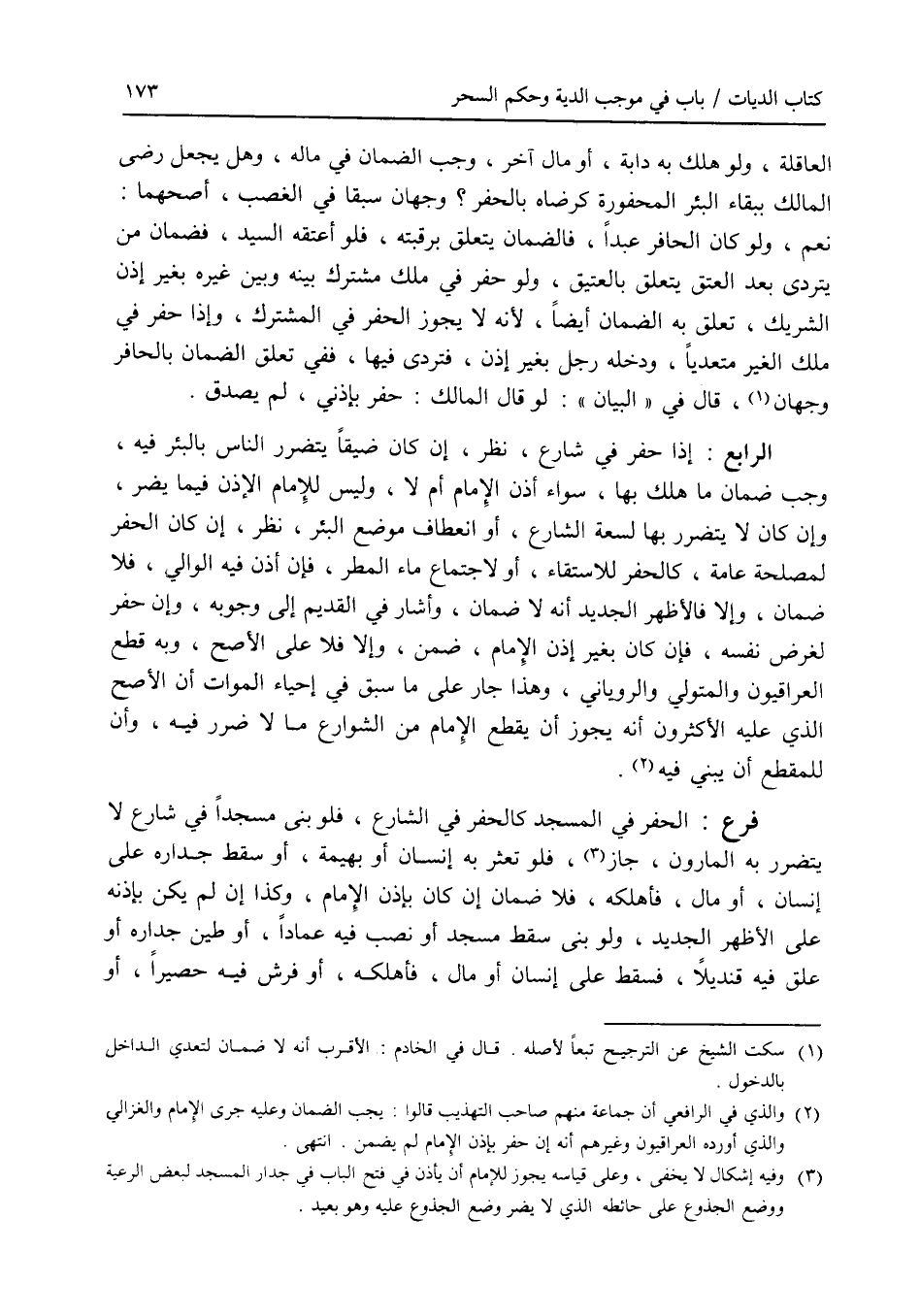 العاقلة، ولو هلك به دابة، أو مال آخر، وجب الضمان في ماله، وهل يجعل رضى المالك ببقاء البئر المحفورة كرضاه بالحفر ؟ وجهان سبقا في الغصب، أصحهما: نعم، ولو كان الحافر عبدا، فالضمان يتعلق برقبته، فلو أعتقه السيد، فضمان من يتردى بعد العتق يتعلق بالعتيق، ولو حفر في ملك مشترك بينه وبين غيره بغير إذن الشريك، تعلق به الضمان أيضا، لانه لا يجوز الحفر في المشترك، وإذا حفر في ملك الغير متعديا، ودخله رجل بغير إذن، فتردى فيها، ففي تعلق الضمان بالحافر وجهان، قال في البيان: لو قال المالك: حفر بإذني، لم يصدق. الرابع: إذا حفر في شارع، نظر، إن كان ضيقا يتضرر الناس بالبئر فيه، وجب ضمان ما هلك بها، سواء أذن الامام أم لا، وليس للامام الاذن فيما يضر، وإن كان لا يتضرر بها لسعة الشارع، أو انعطاف موضع البئر، نظر، إن كان الحفر لمصلحة عامة، كالحفر للاستقاء، أو لاجتماع ماء المطر، فإن أذن فيه الوالي، فلا ضمان، وإلا فالاظهر الجديد أنه لا ضمان، وأشار في القديم إلى وجوبه، وإن حفر لغرض نفسه، فإن كان بغير إذن الامام، ضمن، وإلا فلا على الاصح، وبه قطع العراقيون والمتولي والروياني، وهذا جار على ما سبق في إحياء الموات أن الاصح الذي عليه الاكثرون أنه يجوز أن يقطع الامام من الشوارع ما لا ضرر فيه، وأن للمقطع أن يبني فيه. فرع الحفر في المسجد كالحفر في الشارع، فلو بنى مسجدا في شارع لا يتضرر به المارون، جاز، فلو تعثر به إنسان أو بهيمة، أو سقط جداره على إنسان، أو مال، فأهلكه، فلا ضمان إن كان بإذن الامام، وكذا إن لم يكن بإذنه على الاظهر الجديد، ولو بنى سقف مسجد أو نصب فيه عمادا، أو طين جداره أو علق فيه قنديلا، فسقط على إنسان أو مال، فأهلكه، أو فرش فيه حصيرا، أو