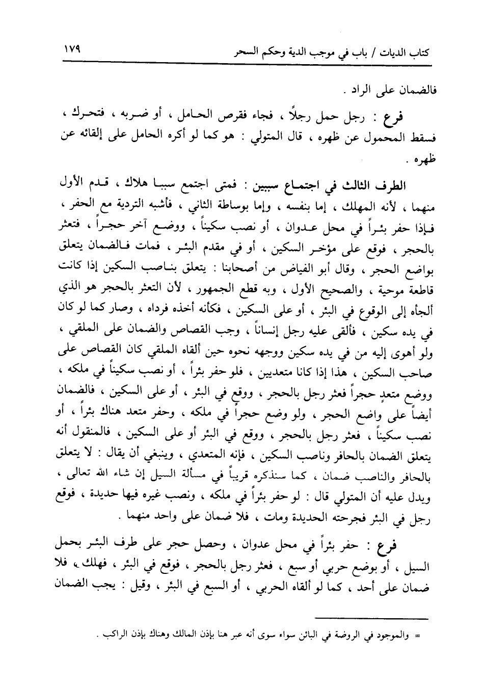 فمتى اجتمع سببا هلاك، قدم الاول منهما، لانه المهلك، إما بنفسه، وإما بوساطة الثاني، فأشبه التردية مع الحفر، فإذا حفر بئرا في محل عدوان، أو نصب سكينا، ووضع آخر حجرا، فتعثر بالحجر، فوقع على مؤخر السكين، أو في مقدم البئر، فمات فالضمان يتعلق بواضع الحجر، وقال أبو الفياض من أصحابنا: يتعلق بناصب السكين إذا كانت قاطعة موحية، والصحيح الاول، وبه قطع الجمهور، لان التعثر بالحجر هو الذي ألجأه إلى الوقوع في البئر، أو على السكين، وكأنه أخذه فرداه، وصار كما لو كان في يده سكين، فألقى عليه رجل إنسانا، وجب القصاص والضمان على الملقي، ولو أهوى إليه من في يده سكين ووجهه نحوه حين ألقاه الملقي كان القصاص على صاحب السكين، هذا إذا كانا متعديين، فلو حفر بئرا، أو نصب سكينا في ملكه، ووضع متعد حجرا فعثر رجل بالحجر، ووقع في البئر، أو على السكين، فالضمان أيضا على واضع الحجر، ولو وضع حجرا في ملكه، وحفر متعد هناك بئرا، أو نصب سكينا، فعثر رجل بالحجر، ووقع في البئر أو على السكين، فالمنقول أنه يتعلق الضمان بالحافر وناصب السكين، فإنه المتعدي، وينبغي أن يقال: لا يتعلق بالحافر والناصب ضمان، كما سنذكره قريبا في مسألة السيل إن شاء الله تعالى، ويدل عليه أن المتولي قال: لو حفر بئرا في ملكه، ونصب غيره فيها حديدة، فوقع رجل في البئر فجرحته الحديدة ومات، فلا ضمان على واحد منهما. فرع حفر بئرا في محل عدوان، وحصل حجر على طرف البئر بحمل السيل، أو بوضع حربي أو سبع، فعثر رجل بالحجر، فوقع في البئر، فهلك، فلا ضمان على أحد، كما لو ألقاه الحربي، أو السبع في البئر، وقيل: يجب الضمان