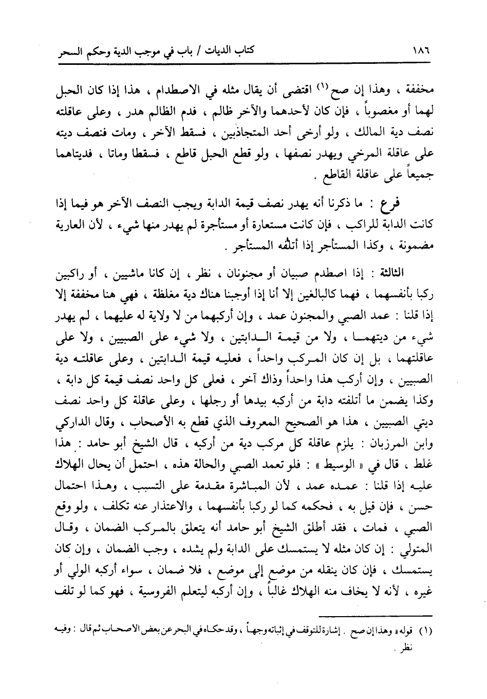 مخففة، وهذا إن صح اقتضى أن يقال مثله في الاصطدام، هذا إذا كان الحبل لهما أو مغصوبا، فإن كان لاحدهما والآخر ظالم، فدم الظالم هدر، وعلى عاقلته نصف دية المالك، ولو أرخى أحد المتجاذبين، فسقط الآخر، ومات فنصف ديته على عاقلة المرخي ويهدر نصفها، ولو قطع الحبل قاطع، فسقطا وماتا، فديتاهما جميعا على عاقلة القاطع. فرع ما ذكرنا أنه يهدر نصف قيمة الدابة ويجب النصف الآخر هو فيما إذا كانت الدابة للراكب، فإن كانت مستعارة أو مستأجرة لم يهدر منها شئ، لان العارية مضمونة، وكذا المستأجر إذا أتلفه المستأجر. الثالثة: إذا اصطدم صبيان أو مجنونان، نظر، إن كانا ماشيين، أو راكبين ركبا بأنفسهما، فهما كالبالغين إلا أنا إذا أوجبنا هناك دية مغلظة، فهي هنا مخففة إلا إذا قلنا: عمد الصبي والمجنون عمد، وإن أركبهما من لا ولاية له عليهما، لم يهدر شئ من ديتهما، ولا من قيمة الدابتين، ولا شئ على الصبيين، ولا على عاقلتهما، بل إن كان المركب واحدا، فعليه قيمة الدابتين، وعلى عاقلته دية الصبيين، وإن أركب هذا واحدا وذاك آخر، فعلى كل واحد نصف قيمة كل دابة، وكذا يضمن ما أتلفته دابة من أركبه بيدها أو رجلها، وعلى عاقلة كل واحد نصف ديتي الصبيين، هذا هو الصحيح المعروف الذي قطع به الاصحاب، وقال الداركي وابن المرزبان: يلزم عاقلة كل مركب دية من أركبه، قال الشيخ أبو حامد: هذا غلط، قال في الوسيط: فلو تعمد الصبي والحالة هذه، احتمل أن يحال الهلاك عليه إذا قلنا: عمده عمد، لان المباشرة مقدمة على التسبب، وهذا احتمال حسن، فإن قيل به، فحكمه كما لو ركبا بأنفسهما، والاعتذار عنه تكلف، ولو وقع الصبي، فمات، فقد أطلق الشيخ أبو حامد أنه يتعلق بالمركب الضمان، وقال المتولي: إن كان مثله لا يستمسك على الدابة ولم يشده، وجب الضمان، وإن كان يستمسك، فإن كان ينقله من موضع إلى موضع، فلا ضمان، سواء أركبه الولي أو غيره، لانه لا يخاف منه الهلاك غالبا، وإن أركبه ليتعلم الفروسية، فهو كما لو تلف