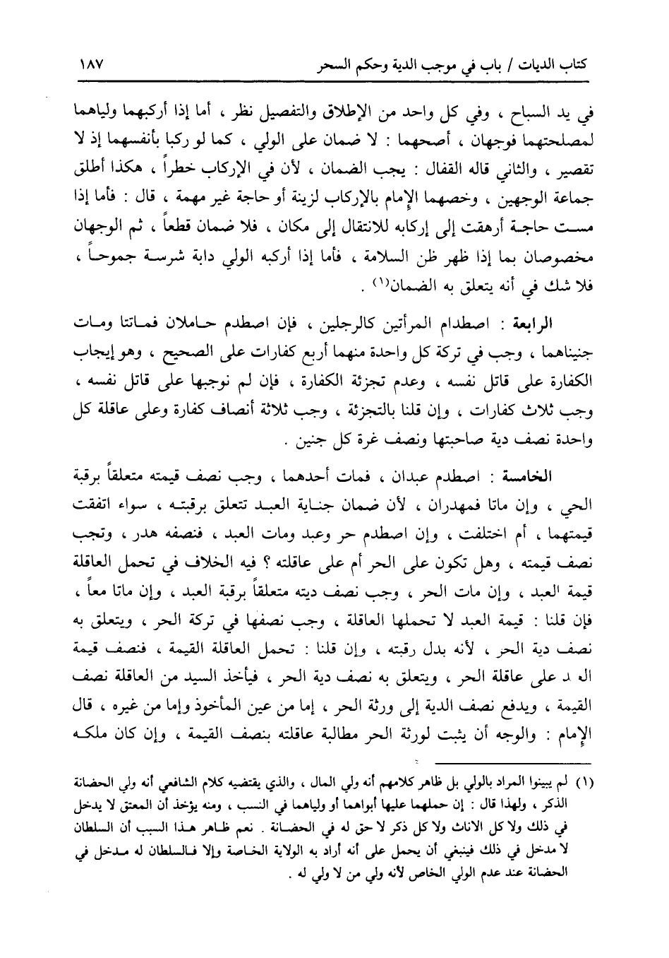 في يد السباح، وفي كل واحد من الاطلاق والتفصيل نظر، أما إذا أركبهما ولياهما لمصلحتهما فوجهان، أصحهما: لا ضمان على الولي، كما لو ركبا بأنفسهما إذ لا تقصير، والثاني قاله القفال: يجب الضمان، لان في الا ركاب خطرا، هكذا أطلق جماعة الوجهين، وخصهما الامام بالاركاب لزينة أو حاجة غير مهمة، قال: فأما إذا مست حاجة أرهقت إلى إركابه للانتقال إلى مكان، فلا ضمان قطعا، ثم الوجهان مخصوصان بما إذا ظهر ظن السلامة، فأما إذا أركبه الولي دابة شرسة جموحا، فلا شك في أنه يتعلق به الضمان. الرابعة: اصطدام المرأتين كالرجلين، فإن اصطدم حاملان فماتتا ومات جنيناهما، وجب في تركة كل واحدة منهما أربع كفارات على الصحيح، وهو إيجاب الكفارة على قاتل نفسه، وعدم تجزئة الكفارة، فإن لم نوجبها على قاتل نفسه، وجب ثلاث كفارات، وإن قلنا بالتجزئة، وجب ثلاثة أنصاف كفارة وعلى عاقلة كل واحدة نصف دية صاحبتها ونصف غرة كل جنين. الخامسة: اصطدم عبدان، فمات أحدهما، وجب نصف قيمته متعلقا برقبة الحي، وإن ماتا فمهدران، لان ضمان جناية العبد تتعلق برقبته، سواء اتفقت قيمتهما، أم اختلفت، وإن اصطدم حر وعبد ومات العبد، فنصفه هدر، وتجب نصف قيمته، وهل تكون على الحر أم على عاقلته ؟ فيه الخلاف في تحمل العاقلة قيمة العبد، وإن مات الحر، وجب نصف ديته متعلقا برقبة العبد، وإن ماتا معا، فإن قلنا: قيمة العبد لا تحملها العاقلة، وجب نصفها في تركة الحر، ويتعلق به نصف دية الحر، لانه بدل رقبته، وإن قلنا: تحمل العاقلة القيمة، فنصف قيمة العبد على عاقلة الحر، ويتعلق به نصف دية الحر، فيأخذ السيد من العاقلة نصف القيمة، ويدفع نصف الدية إلى ورثة الحر، إما من عين المأخوذ وإما من غيره، قال الامام: والوجه أن يثبت لورثة الحر مطالبة عاقلته بنصف القيمة، وإن كان ملكه