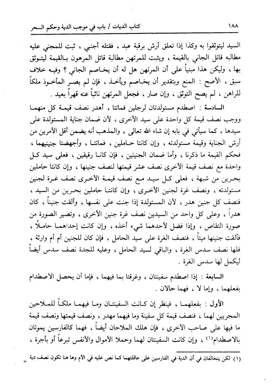 السيد ليتوثقوا به وكذا إذا تعلق أرش برقبة عبد، فقتله أجنبي، ثبت للمجني عليه مطالبة قاتل الجاني بالقيمة، ويثبت للمرتهن مطالبة قاتل المرهون بالقيمة ليتوثق بها، وليكن هذا مبنيا على أن المرتهن هل له أن يخاصم الجاني ؟ وفيه خلاف سبق، الاصح: المنع وبتقدير أن يخاصم ويأخذ، فإن لم يصر المأخوذ ملكا للراهن، لم يصح التوثق، وإن صار، فجعل المرتهن نائبا عنه قهرا بعيد. السادس: اصطدم مستولدتان لرجلين فماتتا، أهدر نصف قيمة كل منهما ووجب نصف قيمة كل واحدة على سيد الاخرى، لان ضمان جناية المستولدة على سيدها، كما سيأتي في بابه إن شاء الله تعالى، والمذهب أنه يضمن أقل الامرين من أرش الجناية وقيمة مستولدته، وإن كانتا حاملين، فماتتا، وأجهضتا جنينهما، فحكم القيمة ما ذكرنا، وأما ضمان الجنينين، فإن كانا رقيقين، فعلى سيد كل واحدة مع نصف قيمة الاخرى نصف عشر قيمتها لنصف جنينها، وإن كانتا حاملين بحرين من شبهة، فعلى كل سيد مع نصف قيمة الاخرى نصف غرة لجنين مستولدته، ونصف غرة لجنين الاخرى، وإن كانتا حاملين بحرين من السيدين، فنصف كل جنين هدر، لان المستولدة إذا جنت على نفسها، وألقت جنينا، كان هدرا، وعلى كل واحد من السيدين نصف غرة جنين الاخرى، وتصير الصورة من صور التقاص، وإذا فضل لاحدهما شئ أخذه، وإن كانت إحداهما حاملا، فألقت جنينها ميتا، فنصف الغرة على سيد الحامل، فإن كان للجنين أم أم وارثة، فلها نصف سدس الغرة، والباقي لسيد الحامل، وعليه للجدة نصف سدس أيضا ل يكمل لها سدس الغرة. السابعة: إذا اصطدم سفينتان، وغرقتا بما فيهما، فإما أن يحصل الاصطدام بفعلهما، وإما لا، فهما حالان. الاول بفعلهما، فينظر إن كانت السفينتان وما فيهما ملكا للملاحين المجريين لهما، فنصف قيمة كل سفينة وما فيهما مهدر، ونصف قيمتها ونصف قيمة ما فيها على صاحب الاخرى، فإن هلك الملاحان أيضا، فهما كالفارسين يموتان بالاصطدام، وإن كانت السفينتان لهما وحملا الاموال والانفس تبرعا أو بأجرة،