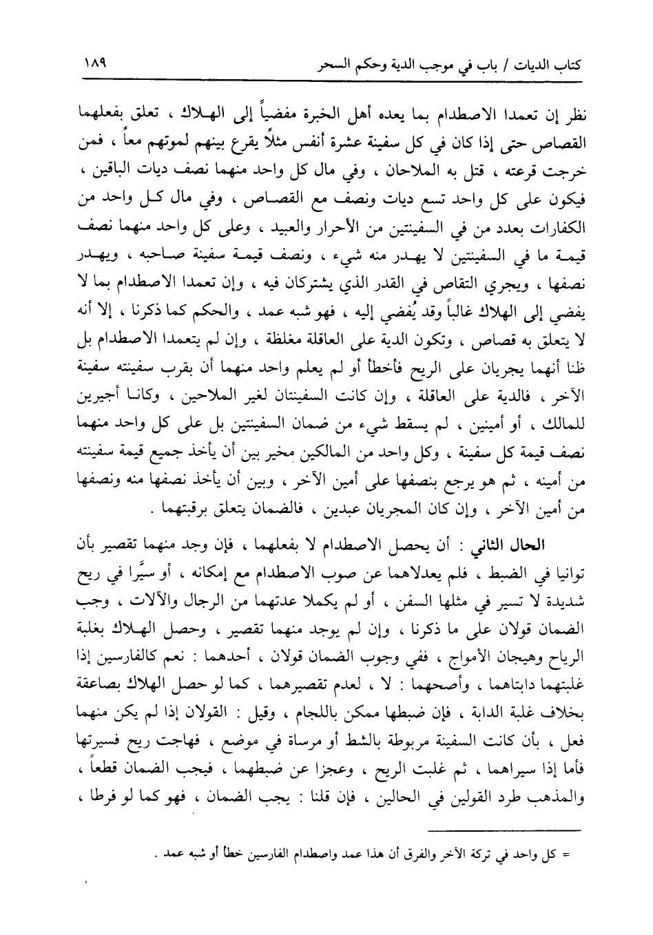 نظر إن تعمدا الاصطدام بما يعده أهل الخبرة مفضيا إلى الهلاك، تعلق بفعلهما القصاص حتى إذا كان في كل سفينة عشرة أنفس مثلا يقرع بينهم لموتهم معا، فمن خرجت قرعته، قتل به الملاحان، وفي مال كل واحد منهما نصف ديات الباقين، فيكون على كل واحد تسع ديات ونصف مع القصاص، وفي مال كل واحد من الكفارات بعدد من في السفينتين من الاحرار والعبيد، وعلى كل واحد منهما نصف قيمة ما في السفينتين لا يهدر منه شئ، ونصف قيمة سفينة صاحبه، ويهدر نصفها، ويجري التقاص في القدر الذي يشتركان فيه، وإن تعمدا الاصطدام بما لا يفضي إلى الهلاك غالبا وقد يفضي إليه، فهو شبه عمد، والحكم كما ذكرنا، إلا أنه لا يتعلق به قصاص، وتكون الدية على العاقلة مغلظة، وإن لم يتعمدا الاصطدام بل ظنا أنهما يجريان على الريح فأخطأ أو لم يعلم واحد منهما أن بقرب سفينته سفينة الآخر، فالدية على العاقلة، وإن كانت السفينتان لغير الملاحين، وكانا أجيرين للمالك، أو أمينين، لم يسقط شئ من ضمان السفينتين بل على كل واحد منهما نصف قيمة كل سفينة، وكل واحد من المالكين مخير بين أن يأخذ جميع قيمة سفينته من أمينه، ثم هو يرجع بنصفها على أمين الآخر، وبين أن يأخذ نصفها منه ونصفها من أمين الآخر، وإن كان المجريان عبدين، فالضمان يتعلق برقبتهما. الحال الثاني: أن يحصل الاصطدام لا بفعلهما، فإن وجد منهما تقصير بأن توانيا في الضبط، فلم يعدلاهما عن صوب الاصطدام مع إمكانه، أو سيرا في ريح شديدة لا تسير في مثلها السفن، أو لم يكملا عدتهما من الرجال والآلات، وجب الضمان على ما ذكرنا، وإن لم يوجد منهما تقصير، وحصل الهلاك بغلبة الرياح وهيجان الامواج، ففي وجوب الضمان قولان، أحدهما: نعم كالفارسين إذا غلبتهما دابتاهما، وأصحهما: لا، لعدم تقصيرهما، كما لو حصل الهلاك بصاعقة بخلاف غلبة الدابة، فإن ضبطها ممكن باللجام، وقيل: القولان إذا لم يكن منهما فعل، بأن كانت السفينة مربوطة بالشط أو مرساة في موضع، فهاجت ريح فسيرتها فأما إذا سيراهما، ثم غلبت الريح، وعجزا عن ضبطهما، فيجب الضمان قطعا، والمذهب طرد القولين في الحالين، فإن قلنا: يجب الضمان، فهو كما لو فرطا،