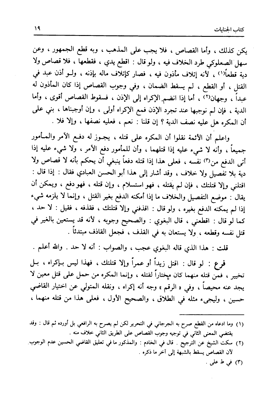 يكن كذلك، وأما القصاص، فلا يجب على المذهب، وبه قطع الجمهور، وعن سهل الصعلوكي طرد الخلاف فيه، ولو قال: اقطع يدي، فقطعها، فلا قصاص ولا دية قطعا، لانه إتلاف مأذون فيه، فصار كإتلاف ماله بإذنه، ولو أذن عبد في القتل، أو القطع، لم يسقط الضمان، وفي وجوب القصاص إذا كان المأذون له عبدا، وجهان، أما إذا انضم الاكراه إلى الاذن، فسقوط القصاص أقوى، وأما الدية، فإن لم نوجبها عند تجرد الاذن فمع الاكراه أولى، وإن أوجبناها، بني على أن المكره هل عليه نصف الدية ؟ إن قلنا: نعم، فعليه نصفها، وإلا فلا. واعلم أن الائمة نقلوا أن المكره على قتله، يجوز له دفع الآمر والمأمور جميعا، وأنه لا شئ عليه إذا قتلهما، وأن للمأمور دفع الآمر، ولا شئ عليه إذا أتى الدفع على نفسه، فعلى هذا إذا قتله دفعا ينبغي أن يحكم بأنه لا قصاص ولا دية بلا تفصيل ولا خلاف، وقد أشار إلى هذا أبو الحسن العبادي فقال: إذا قال: اقتلني وإلا قتلتك، فإن لم يقتله، فهو استسلام، وإن قتله، فهو دفع، ويمكن أن يقال: موضع التفصيل والخلاف ما إذا أمكنه الدفع بغير القتل، وإنما لا يلزمه شئ إذا لم يمكنه الدفع بغيره، ولو قال: اقذفني وإلا قتلتك، فقذفه، فقيل: لا حد، كما لو قال: اقطعني، قال البغوي: والصحيح وجوبه، لانه قد يستعين بالغير في قتل نفسه وقطعه، ولا يستعان به في القذف، فجعل القاذف مبتدئا. قلت: هذا الذي قاله البغوي عجب، والصواب: أنه لا حد. والله أعلم. فرع لو قال: اقتل زيدا أو عمرا وإلا قتلتك، فهذا ليس بإكراه، بل تخيير، فمن قتله منهما كان مختارا لقتله، وإنما المكره من حمل على قتل معين لا يجد عنه محيصا، وفي الرقم وجه أنه إكراه، ونقله المتولي عن اختيار القاضي حسين، وليجئ مثله في الطلاق، والصحيح الاول، فعلى هذا من قتله منهما،