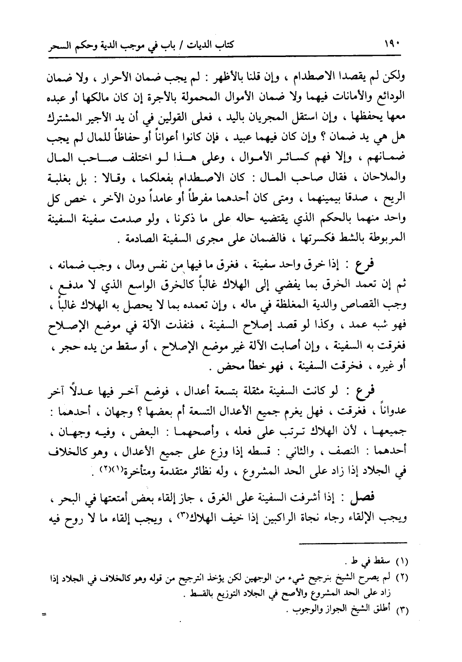 ولكن لم يقصدا الاصطدام، وإن قلنا بالاظهر: لم يجب ضمان الاحرار، ولا ضمان الودائع والامانات فيهما ولا ضمان الاموال المحمولة بالاجرة إن كان مالكها أو عبده معها يحفظها، وإن استقل المجريان باليد، فعلى القولين في أن يد الاجير المشترك هل هي يد ضمان ؟ وإن كان فيهما عبيد، فإن كانوا أعوانا أو حفاظا للمال لم يجب ضمانهم، وإلا فهم كسائر الاموال، وعلى هذا لو اختلف صاحب المال والملاحان، فقال صاحب المال: كان الاصطدام بفعلكما، وقالا: بل بغلبة الريح، صدقا بيمينهما، ومتى كان أحدهما مفرطا أو عامدا دون الآخر، خص كل واحد منهما بالحكم الذي يقتضيه حاله على ما ذكرنا، ولو صدمت سفينة السفينة المربوطة بالشط فكسرتها، فالضمان على مجري السفينة الصادمة. فرع إذا خرق واحد سفينة، فغرق ما فيها من نفس ومال، وجب ضمانه، ثم إن تعمد الخرق بما يفضي إلى الهلاك غالبا كالخرق الواسع الذي لا مدفع، وجب القصاص والدية المغلظة في ماله، وإن تعمده بما لا يحصل به الهلاك غالبا، فهو شبه عمد، وكذا لو قصد إصلاح السفينة، فنفذت الآلة في موضع الاصلاح فغرقت به السفينة، وإن أصابت الآلة غير موضع الاصلاح، أو سقط من يده حجر، أو غيره، فخرقت السفينة، فهو خطأ محض. فرع لو كانت السفينة مثقلة بتسعة أعدال، فوضع آخر فيها عدلا آخر عدوانا، فغرقت، فهل يغرم جميع الاعدال التسعة أم بعضها ؟ وجهان، أحدهما: جميعها، لان الهلاك ترتب على فعله، وأصحهما: البعض، وفيه وجهان، أحدهما: النصف، والثاني: قسطه إذا وزع على جميع الاعدال، وهو كالخلاف في الجلاد إذا زاد على الحد المشروع، وله نظائر متقدمة. فصل إذا أشرفت السفينة على الغرق، جاز إلقاء بعض أمتعتها في البحر، ويجب الالقاء رجاء نجاة الراكبين إذا خيف الهلاك، ويجب إلقاء ما لا روح فيه