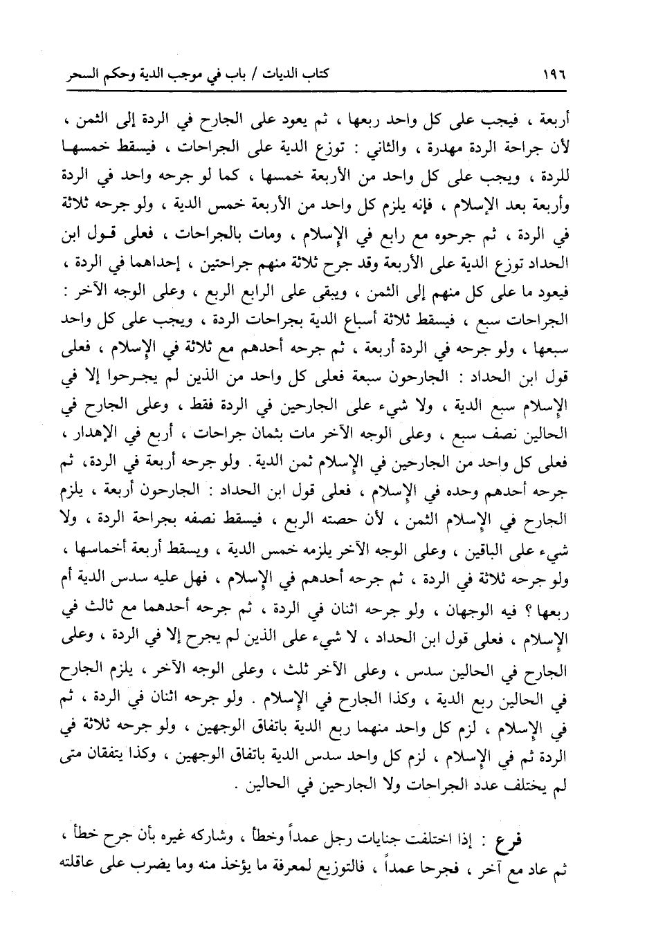 أربعة، فيجب على كل واحد ربعها، ثم يعود ما على الجارح في الردة إلى الثمن، لان جراحة الردة مهدرة، والثاني: توزع الدية على الجراحات، فيسقط خمسها للردة، ويجب على كل واحد من الاربعة خمسها، كما لو جرحه واحد في الردة وأربعة بعد الاسلام، فإنه يلزم كل واحد من الاربعة خمس الدية، ولو جرحه ثلاثة في الردة، ثم جرحوه مع رابع في الاسلام، ومات بالجراحات، فعلى قول ابن الحداد توزع الدية على الاربعة وقد جرح ثلاثة منهم جراحتين، إحداهما في الردة، فيعود ما على كل منهم إلى الثمن، ويبقى على الرابع الربع، وعلى الوجه الآخر: الجراحات سبع، فيسقط ثلاثة أسباع الدية بجراحات الردة، ويجب على كل واحد سبعها، ولو جرحه في الردة أربعة، ثم جرحه أحدهم مع ثلاثة في الاسلام، فعلى قول ابن الحداد: الجارحون سبعة فعلى كل واحد من الذين لم يجرحوا إلا في الاسلام سبع الدية، ولا شئ على الجارحين في الردة فقط، وعلى الجارح في الحالين نصف سبع، وعلى الوجه الآخر مات بثمان جراحات، أربع في الاهدار، فعلى كل واحد من الجارحين في الاسلام ثمن الدية. ولو جرحه أربعة في الردة، ثم جرحه أحدهم وحده في الاسلام، فعلى قول ابن الحداد: الجارحون أربعة، يلزم الجارح في الاسلام الثمن، لان حصته الربع، فيسقط نصفه بجراحة الردة، ولا شئ على الباقين، وعلى الوجه الآخر يلزمه خمس الدية، ويسقط أربعة أخماسها، ولو جرحه ثلاثة في الردة، ثم جرحه أحدهم في الاسلام، فهل عليه سدس الدية أم ربعها ؟ فيه الوجهان، ولو جرحه اثنان في الردة، ثم جرحه أحدهما مع ثالث في الاسلام، فعلى قول ابن الحداد، لا شئ على الذين لم يجرح إلا في الردة، وعلى الجارح في الحالين سدس، وعلى الآخر ثلث، وعلى الوجه الآخر، يلزم الجارح في الحالين ربع الدية، وكذا الجارح في الاسلام. ولو جرحه اثنان في الردة، ثم في الاسلام، لزم كل واحد منهما ربع الدية باتفاق الوجهين، ولو جرحه ثلاثة في الردة ثم في الاسلام، لزم كل واحد سدس الدية باتفاق الوجهين، وكذا يتفقان متى لم يختلف عدد الجراحات ولا الجارحين في الحالين. فرع إذا اختلف جنايات رجل عمدا وخطأ، وشاركه غيره بأن جرح خطأ، ثم عاد مع آخر، فجرحا عمدا، فالتوزيع لمعرفة ما يؤخذ منه وما يضرب على عاقلته