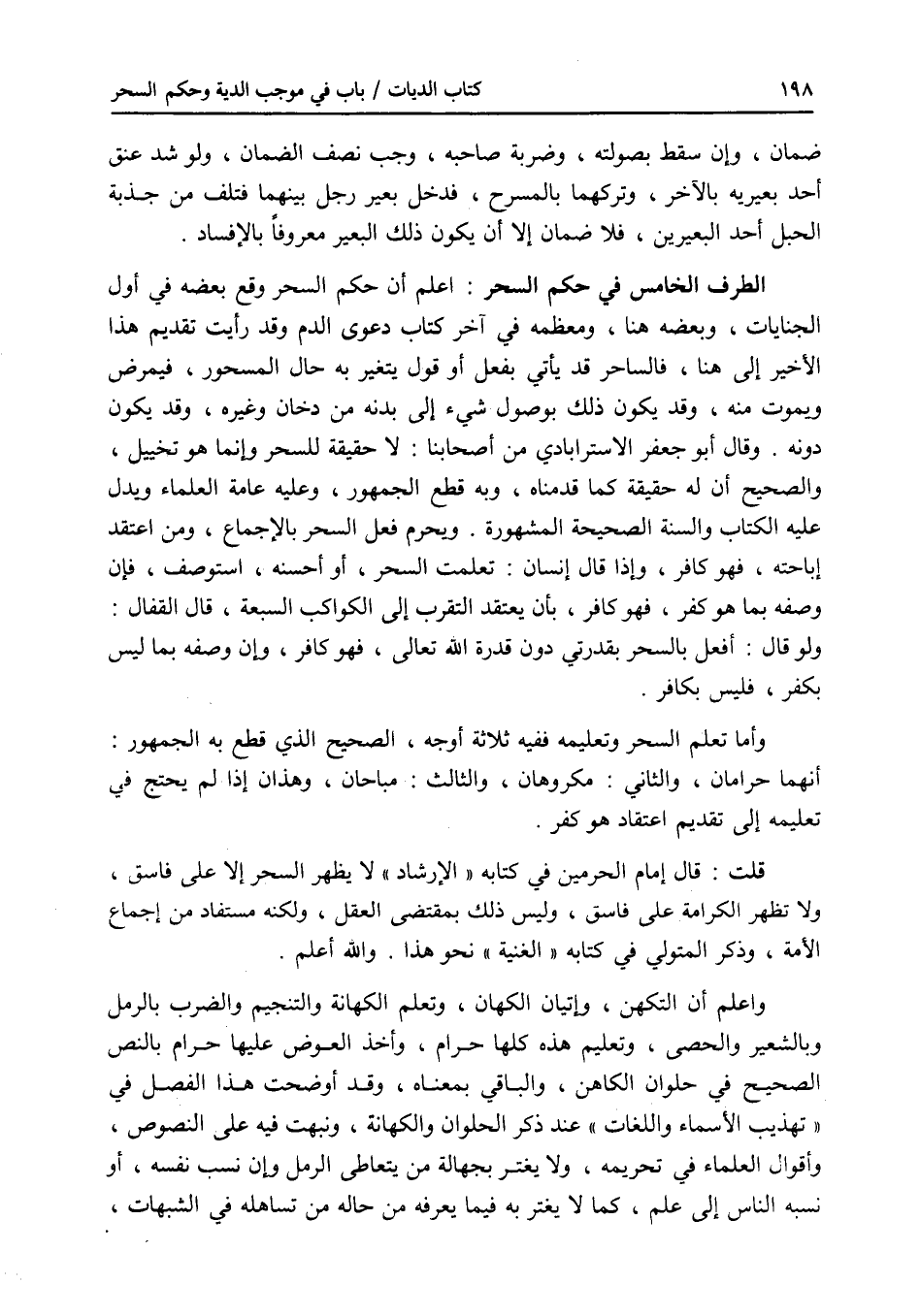 اعلم أن حكم السحر وقع بعضه في أول الجنايات، وبعضه هنا، ومعظمه في آخر كتاب دعوى الدم وقد رأيت تقديم هذا الأخير إلى هنا، فالساحر قد يأتي بفعل أو قول يتغير به حال المسحور، فيمرض ويموت منه، وقد يكون ذلك بوصول شئ إلى بدنه من دخان وغيره، وقد يكون دونه. وقال أبو جعفر الاسترابادي من أصحابنا: لا حقيقة للسحر وإنما هو تخييل، والصحيح أن له حقيقة كما قدمناه، وبه قطع الجمهور، وعليه عامة العلماء ويدل عليه الكتاب والسنة الصحيحة المشهورة. ويحرم فعل السحر بالاجماع، ومن اعتقد إباحته، فهو كافر، وإذا قال إنسان: تعلمت السحر، أو أحسنه، استوصف، فإن وصفه بما هو كفر فهو كافر، بأن يعتقد التقرب إلى الكواكب السبعة، قال القفال: ولو قال: أفعل بالسحر بقدرتي دون قدرة الله تعالى، فهو كافر، وإن وصفه بما ليس بكفر، فليس بكافر. وأما تعلم السحر وتعليمه ففيه ثلاثة أوجه، الصحيح الذي قطع به الجمهور: أنهما حرامان، والثاني: مكروهان، والثالث: مباحان، وهذان إذا لم يحتج في تعليمه إلى تقديم اعتقاد هو كفر. قلت: قال إمام الحرمين في كتابه الارشاد: لا يظهر السحر إلا على فاسق، ولا تظهر الكرامة على فاسق، وليس ذلك بمقتضى العقل، ولكنه مستفاد من إجماع الامة، وذكر المتولي في كتابه الغنية نحو هذا. والله أعلم. واعلم أن التكهن، وإتيان الكهان، وتعلم الكهانة والتنجيم والضرب بالرمل وبالشعير والحصى، وتعليم هذه كلها حرام، وأخذ العوض عليها حرام بالنص الصحيح في حلوان الكاهن، والباقي بمعناه، وقد أوضحت هذا الفصل في تهذيب الاسماء واللغات عند ذكر الحلوان والكهانة، ونبهت فيه على النصوص، وأقوال العلماء في تحريمه، ولا يغتر بجهالة من يتعاطى الرمل وإن نسب نفسه، أو نسبه الناس إلى علم، كما لا يفتر به فيما يعرفه من حاله من تساهله في الشبهات،