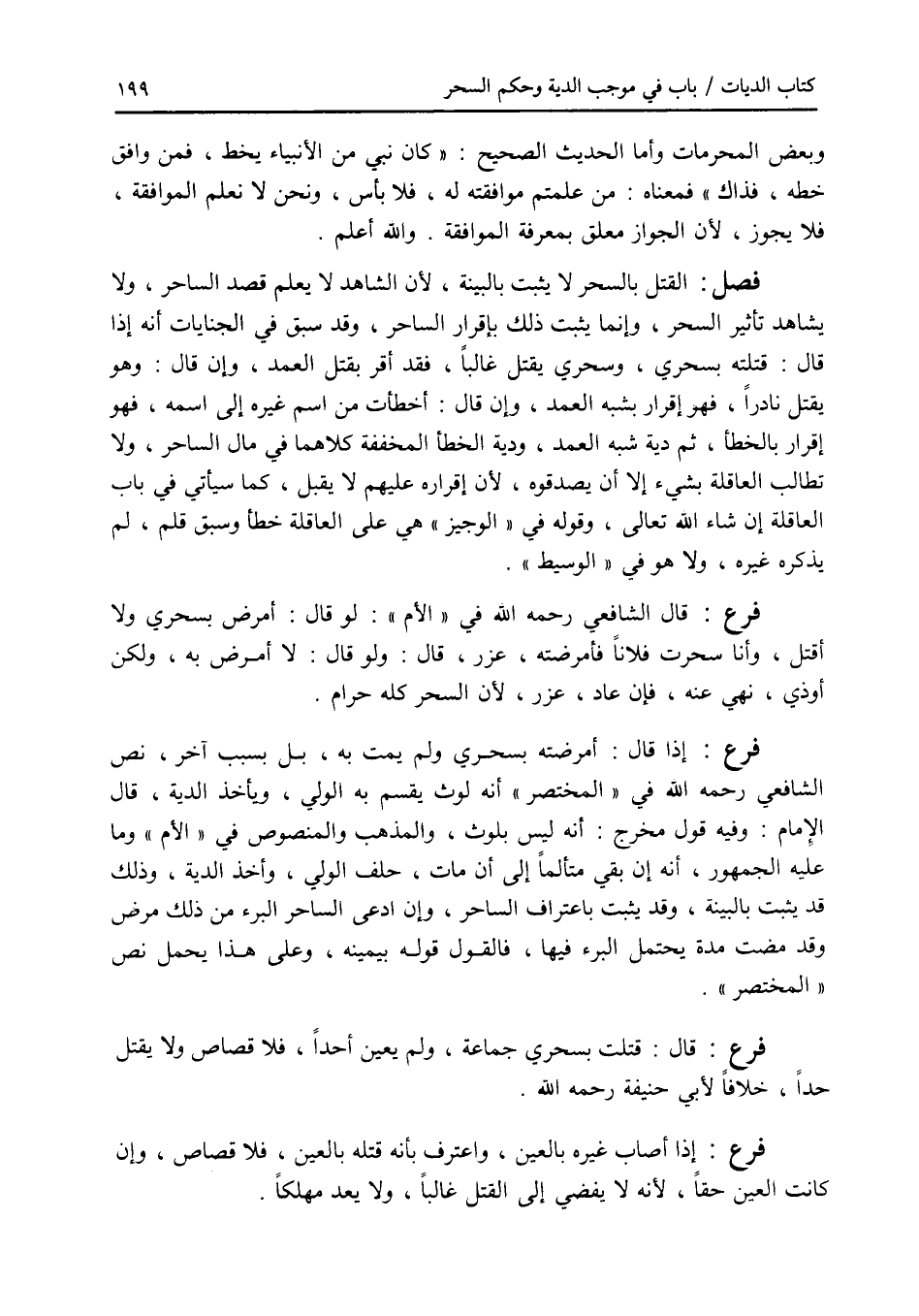 فصل القتل بالسحر لا يثبت بالبينة، لأن الشاهد لا يعلم قصد الساحر، ولا يشاهد تأثير السحر، وإنما يثبت ذلك بإقرار الساحر، وقد سبق في الجنايات أنه إذا قال: قتلته بسحري، وسحري يقتل غالبا، فقد أقر بقتل العمد، وإن قال: وهو يقتل نادرا، فهو إقرار بشبه العمد، وإن قال: أخطأت من اسم غيره إلى اسمه، فهو إقرار بالخطإ، ثم ديه شبه العمد، ودية الخطإ المخففة كلاهما في مال الساحر، ولا تطالب العاقلة بشئ إلا أن يصدقوه، لان إقراره عليهم لا يقبل، كما سيأتي في باب العاقلة إن شاء الله تعالى، وقوله في الوجيز هي على العاقلة خطأ وسبق قلم، لم يذكره غيره، ولا هو في الوسيط. فرع قال الشافعي رحمه الله في الام: لو قال: أمرض بسحري ولا أقتل، وأنا سحرت فلانا فأمرضته، عزر، قال: ولو قال: لا أمرض به، ولكن أوذي، نهي عنه، فإن عاد، عزر، لان السحر كله حرام. فرع إذا قال: أمرضته بسحري ولم يمت به، بل بسبب آخر، نص الشافعي رحمه الله في المختصر أنه لوث يقسم به الولي، ويأخذ الدية، قال الامام: وفيه قول مخرج: إنه ليس بلوث، والمذهب والمنصوص في الام وما عليه الجمهور، أنه إن بقي متألما إلى أن مات، حلف الولي، وأخذ الدية، وذلك قد يثبت بالبينة، وقد يثبت باعتراف الساحر، وإن ادعى الساحر البرء من ذلك المرض وقد مضت مدة يحتمل البرء فيها، فالقول قوله بيمينه، وعلى هذا يحمل نص المختصر. فرع قال: قتلت بسحري جماعة، ولم يعين أحدا، فلا قصاص ولا يقتل حدا، خلافا لابي حنيفة رحمه الله. فرع إذا أصاب غيره بالعين، واعترف بأنه قتله بالعين، فلا قصاص، وإن كانت العين حقا، لانه لا يفضي إلى القتل غالبا، ولا يعد مهلكا.