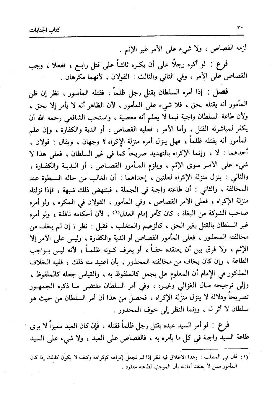فصل إذا أمره السلطان بقتل رجل ظلما، فقتله المأمور، نظر إن ظن المأمور أنه يقتله بحق، فلا شئ على المأمور، لان الظاهر أنه لا يأمر إلا بحق، ولان طاعة السلطان واجبة فيما لا يعلم أنه معصية، واستحب الشافعي رحمه الله أن يكفر لمباشرته القتل، وأما الآمر، فعليه القصاص، أو الدية والكفارة، وإن علم المأمور أنه يقتله ظلما، فهل ينزل أمره منزلة الاكراه ؟ وجهان، ويقال: قولان، أحدهما: لا، وإنما الاكراه بالتهديد صريحا كما في غير السلطان، فعلى هذا لا شئ على الآمر سوى الاثم، ويلزم المأمور القصاص، أو الدية والكفارة، والثاني: ينزل منزلة الاكراه لعلتين، إحداهما: أن الغالب من حالة السطوة عند المخالفة، والثاني: أن طاعته واجبة في الجملة، فينتهض ذلك شبهة، فإذا نزلناه منزلة الاكراه، فعلى الآمر القصاص، وفي المأمور، القولان في المكره، ولو أمره صاحب الشوكة من البغاة، كان كأمر إمام العدل، لان أحكامه نافذة، ولو أمره غير السلطان بالقتل بغير الحق، كالزعيم والمتغلب، فقيل: نظر، إن لم يخف من مخالفته المحذور، فعلى المأمور القصاص أو الدية والكفارة، وليس على الآمر إلا الاثم، ولا فرق بين أن يعتقده حقا، أو يعرف كونه ظلما، لانه ليس بواجب الطاعة، وإن كان يخاف من مخالفته المحذور، بأن اعتيد منه ذلك، ففيه الخلاف المذكور في الامام أن المعلوم هل يجعل كالملفوظ به، والقياس جعله كالملفوظ، وإلى ترجيحه مال الغزالي وغيره، وفي أمر السلطان مقتضى ما ذكره الجمهور تصريحا ودلالة لا ينزل منزلة الاكراه، فحصل من هذا أن أمر السلطان من حيث هو سلطان لا أثر له، وإنما النظر إلى خوف المحذور. فرع لو أمر السيد عبده بقتل رجل ظلما فقتله، فإن كان العبد مميزا لا يرى طاعة السيد واجبة في كل ما يأمره به، فالقصاص على العبد، ولا شئ على السيد