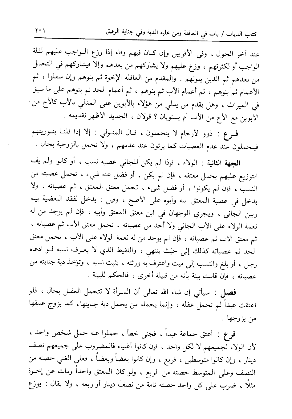 عند آخر الحول، وفي الاقربين فإن كان فيهم وفاء إذا وزع الواجب عليهم لقلة الواجب أو لكثرتهم، وزع عليهم ولا يشاركهم من بعدهم وإلا فيشاركهم في التحمل من بعدهم ثم الذين يلونهم. والمقدم من العاقلة الاخوة ثم بنوهم وإن سفلوا، ثم الاعمام ثم بنوهم، ثم أعمام الاب ثم بنوهم، ثم أعمام الجد ثم بنوهم على ما سبق في الميراث، وهل يقدم من يدلي من هؤلاء بالابوين على المدلي بالاب كالاخ من الابوين مع الاخ من الاب أم يستويان ؟ قولان، الجديد الاظهر تقديمه. فرع ذوو الارحام لا يتحملون، قال المتولي: إلا إذا قلنا بتوريثهم فيتحملون عند عدم العصبات كما يرثون عند عدمهم، ولا تحمل بالزوجية بحال. الجهة الثانية: الولاء، فإذا لم يكن للجاني عصبة نسب، أو كانوا ولم يف التوزيع عليهم يحمل معتقه، فإن لم يكن، أو فضل عنه شئ، تحمل عصبته من النسب، فإن لم يكونوا، أو فضل شئ، تحمل معتق المعتق، ثم عصباته، ولا يدخل في عصبة المعتق ابنه وأبوه على الاصح، وقيل: يدخل لفقد البعضية بينه وبين الجاني، ويجري الوجهان في ابن معتق المعتق وأبيه، فإن لم يوجد من له نعمة الولاء على الاب الجاني ولا أحد من عصباته، تحمل معتق الاب ثم عصباته، ثم معحق معتق الاب ثم عصباته، فإن لم يوجد من له نعمة الولاء على الاب، تحمل معتق الحد ثم عصباته كذلك إلى حيث ينتهي، واللقيط الذي لا يعرف نسبه لو ادعاه رجل، أو بلغ وانتسب إلى ميت واعترف به ورثته، يثبت نسبه، وتؤخذ دية جنايته من عصباته، فإن قامت بينة بأنه من قبيلة أخرى، فالحكم للبينة. فصل سيأتي إن شاء الله تعالى أن المرأة لا تتحمل العقل بحال، فلو أعتقت عبدا لم تحمل عقله، وإنما يحمله من يحمل دية جنايتها، كما يزوج عتيقها من يزوجها. فرع أعتق جماعة عبدا، فجنى خطأ، حملوا عنه حمل شخص واحد، لان الولاء لجميعهم لا لكل واحد، فإن كانوا أغنياء فالمضروب على جميعهم نصف دينار، وإن كانوا متوسطين، فربع، وإن كانوا بعضا وبعضا، فعلى الغنى حصته من النصف وعلى المتوسط حصته من الربع، ولو كان المعتق واحدا ومات عن إخوة مثلا، ضرب على كل واحد حصته تامة من نصف دينار أو ربعه، ولا يقال: يوزع