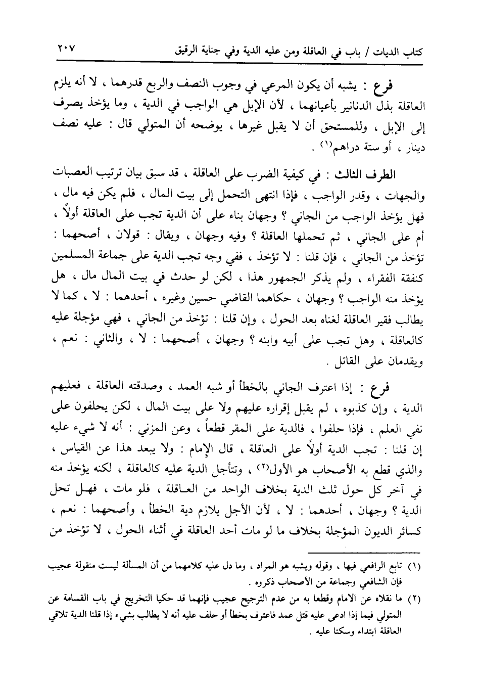 الطرف الثالث : في كيفية الضرب على العاقلة، قد سبق بيان ترتيب العصبات والجهات، وقدر الواجب، فإذا انتهى التحمل إلى بيت المال، فلم يكن فيه مال، فهل يؤخذ الواجب من الجاني ؟ وجهان بناء على أن الدية تجب على العاقلة أولا، أم على الجاني، ثم تحملها العاقلة ؟ وفيه وجهان، ويقال: قولان، أصحهما: تؤخذ من الجاني، فإن قلنا: لا تؤخذ، ففي وجه تجب الدية على جماعة المسلمين كنفقة الفقراء، ولم يذكر الجمهور هذا، لكن لو حدث في بيت المال مال، هل يؤخذ منه الواجب ؟ وجهان، حكاهما القاضي حسين وغيره، أحدهما: لا، كما لا يطالب فقير العاقلة لغناه بعد الحول، وإن قلنا: تؤخذ من الجاني، فهي مؤجلة عليه كالعاقلة، وهل تجب علي أبيه وابنه ؟ وجهان، أصحهما: لا، والثاني: نعم، ويقدمان على القاتل. فرع إذا اعترف الجاني بالخطإ أو شبه العمد، وصدقته العاقلة، فعليهم الدية، وإن كذبوه، لم يقبل إقراره عليهم ولا على بيت المال، لكن يحلفون على نفي العلم، فإذا حلفوا، فالدية على المقر قطعا، وعن المزني: أنه لا شئ عليه إن قلنا: تجب الدية أولا على العاقلة، قال الامام: ولا يبعد هذا عن القياس، والذي قطع به الاصحاب هو الاول، وتتأجل الدية عليه كالعاقلة، لكنه يؤخذ منه في آخر كل حول ثلث الدية بخلاف الواحد من العاقلة، فلو مات، فهل تحل الدية ؟ وجهان، أحدهما: لا، لان الاجل يلازم دية الخطإ، وأصحهما: نعم، كسائر الديون المؤجلة بخلاف ما لو مات أحد العاقلة في أثناء الحول، لا تؤخذ من
