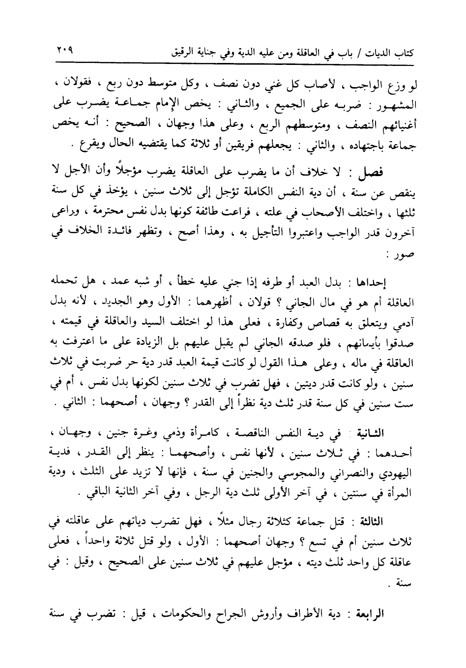 فصل لا خلاف أن ما يضرب على العاقلة يضرب مؤجلا وأن الأجل لا ينقص عن سنة، وأن دية النفس الكاملة تؤجل إلى ثلاث سنين، يؤخذ في كل سنة ثلثها، واختلف الاصحاب في علته، فراعت طائفة كونها بدل نفس محترمة، وراعى آخرون قدر الواجب واعتبروا التأجيل به، وهذا أصح، وتظهر فائدة الخلاف في صور: إحداها: بدل العبد أو طرفه إذا جني عليه خطأ، أو شبه عمد، هل تحمله العاقلة أم هو في مال الجاني ؟ قولان، أظهرهما: الاول وهو الجديد، لانه بدل آدمي ويتعلق به قصاص وكفارة، فعلى هذا لو اختلف السيد والعاقلة في قيمته، صدقوا بأيمانهم، فلو صدقه الجاني لم يقبل عليهم بل الزيادة على ما اعترفت به العاقلة في ماله، وعلى هذا القول لو كانت قيمة العبد قدر دية حر ضربت في ثلاث سنين، ولو كانت قدر ديتين، فهل تضرب في ثلاث سنين لكونها بدل نفس، أم في ست سنين في كل سنة قدر ثلث دية نظرا إلى القدر ؟ وجهان، أصحهما: الثاني. الثانية: في دية النفس الناقصة، كامرأة وذمي وغرة جنين، وجهان، أحدهما: في ثلاث سنين، لانها نفس، وأصحهما: ينظر إلى القدر، فدية اليهودي والنصراني والمجوسي والجنين في سنة، فإنها لا تزيد على الثلث، ودية المرأة في سنتين، في آخر الاولى ثلث دية الرجل، وفي آخر الثانية الباقي. الثالثة: قتل جماعة كثلاثة رجال مثلا، فهل تضرب دياتهم على عاقلته في ثلاث سنين أم في تسع ؟ وجهان أصحهما: الاول، ولو قتل ثلاثة واحدا، فعلى عاقلة كل واحد ثلث ديته، مؤجل عليهم في ثلاث سنين على الصحيح، وقيل: في سنة. الرابعة: دية الاطراف وأروش الجراح والحكومات، قيل: تضرب في سنة