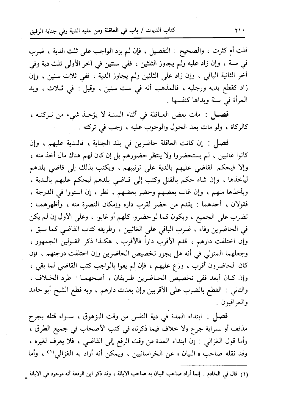 فصل مات بعض العاقلة في أثناء السنة لا يؤخذ شئ من تركته، كالزكاة، ولو مات بعد الحول والوجوب عليه، وجب في تركته. فصل إن كانت العاقلة حاضرين في بلد الجناية، فالدية عليهم، وإن كانوا غائبين، لم يستحضروا ولا ينتظر حضورهم بل إن كان لهم هناك مال أخذ منه، وإلا فيحكم القاضي عليهم بالدية على ترتيبهم، ويكتب بذلك إلى قاضي بلدهم ليأخذها، وإن شاء حكم بالقتل وكتب إلى قاضي بلدهم ليحكم عليهم بالدية، ويأخذها منهم، وإن غاب بعضهم وحضر بعضهم، نظر، إن استووا في الدرجة، فقولان، أحدهما: يقدم من حضر لقرب داره وإمكان النصرة منه، وأظهرهما: تضرب على الجميع، ويكون كما لو حضروا كلهم أو غابوا، وعلى الاول إن لم يكن في الحاضرين وفاء، ضرب الباقي على الغائبين، وطريقه كتاب القاضي كما سبق، وإن اختلفت دارهم، قدم الاقرب دارا فالاقرب، هكذا ذكر القولين الجمهور، وجعلهما المتولي في أنه هل يجوز تخصيص الحاضرين وإن اختلفت درجتهم، فإن كان الحاضرون أقرب، وزع عليهم، فإن لم يفوا بالواجب كتب القاضي لما بقي، وإن كانوا أبعد ففي تخصيص الحاضرين طريقان، أصحهما: طرد الخلاف، والثاني: القطع بالضرب على الاقربين وإن بعدت دارهم، وبه قطع الشيخ أبو حامد والعراقيون. فصل ابتداء المدة في دية النفس من وقت الزهوق، سواء قتله بجرح مذفف أو بسراية جرح ولا خلاف فيما ذكرناه في كتب الاصحاب في جميع الطرق، وأما قول الغزالي: إن ابتداء المدة من وقت الرفع إلى القاضي، فلا يعرف لغيره، وقد نقله صاحب البيان عن الخراسانيين، ويمكن أنه أراد به الغزالي، وأما