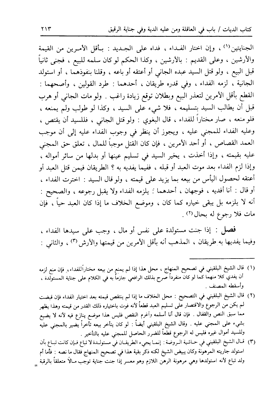 الجنايتين، وإن اختار الفداء، فداه على الجديد: بأقل الامرين من القيمة والارشين، وعلى القديم: بالارشين، وكذا الحكم لو كان سلمه للبيع، فجنى ثانيا قبل البيع، ولو قتل السيد عبده الجاني أو أعتقه أو باعه، وقلنا بنفوذهما، أو استولد الجانية، لزمه الفداء، وفي قدره طريقان، أحدهما: طرد القولين، وأصحهما: القطع بأقل الامرين لتعذر البيع وبطلان توقع زيادة راغب. ولو مات الجاني أو هرب قبل أن يطالب السيد بتسليمه، فلا شئ على السيد، وكذا لو طولب ولم يمنعه، فلو منعه، صار مختارا للفداء، قال البغوي: ولو قتل الجاني، فللسيد أن يقتص، وعليه الفداء للمجني عليه، ويجوز أن ينظر في وجوب الفداء عليه إلى أن موجب العمد القصاص، أو أحد الامرين، فإن كان القتل موجبا للمال، تعلق حق المجني عليه بقيمته، وإذا أخذت، يخير السيد في تسليم عينها أو بدلها من سائر أمواله، وإذا لزم الفداء بعد موت العبد أو قبله، ففيما يفديه به ؟ الطريقان فيمن قتل العبد أو أعتقه لحصول اليأس من بيعه بما يزيد على قيمته، ولو قال السيد: اخترت الفداء، أو قال: أنا أفديه، فوجهان، أحدهما: يلزمه الفداء ولا يقبل رجوعه، والصحيح: أنه لا يلزمه بل يبقى خياره كما كان، وموضع الخلاف ما إذا كان العبد حيا، فإن مات فلا رجوع له بحال.