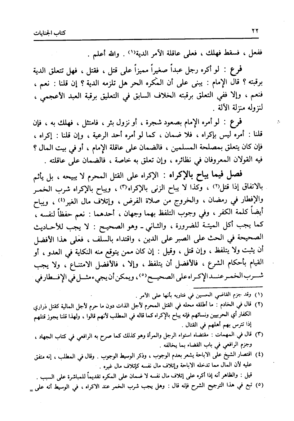 ففعل، فسقط فهلك، فعلى عاقلة الآمر الدية. والله أعلم. فرع لو أكره رجل عبدا صغيرا مميزا على قتل، فقتل، فهل تتعلق الدية برقبته ؟ قال الامام: يبنى على أن المكره الحر هل تلزمه الدية ؟ إن قلنا: نعم، فنعم، وإلا ففي التعلق برقبته الخلاف السابق في التعليق برقبة العبد الاعجمي، لنزوله منزلة الآلة. فرع لو أمره الامام بصعود شجرة، أو نزول بئر، فامتثل، فهلك به، فإن قلنا: أمره ليس بإكراه، فلا ضمان، كما لو أمره أحد الرعية، وإن قلنا: إكراه، فإن كان يتعلق بمصلحة المسلمين، فالضمان على عاقلة الامام، أو في بيت المال ؟ فيه القولان المعروفان في نظائره، وإن تعلق به خاصة، فالضمان على عاقلته.