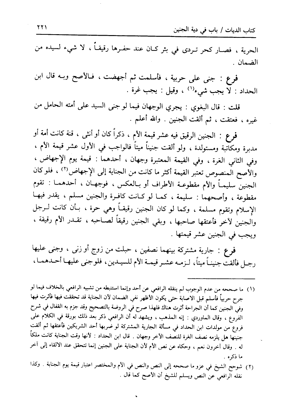 الحرية، فصار كحر تردى في بئر كان عند حفرها رقيقا، لا شئ لسيده من الضمان. فرع جنى على حربية، فأسلمت ثم أجهضت، فالاصح وبه قال ابن الحداد: لا يجب شئ، وقيل: يجب غرة. قلت: قال البغوي: يجري الوجهان فيما لو جنى السيد على أمته الحامل من غيره، فعتقت، ثم ألقت الجنين. والله أعلم. فرع الجنين الرقيق فيه عشر قيمة الام، ذكرا كان أو أنثى، قنة كانت أمه أو مدبرة ومكاتبة ومستولدة، ولو ألقت جنينا ميتا، فعتقت، ثم ألقت آخر ميتا، فالواجب في الاول عشر قيمة الام، وفي الثاني الغرة، وفي القيمة المعتبرة وجهان، أحدهما: قيمة يوم الاجهاض، والاصح المنصوص تعتبر القيمة أكثر ما كانت من الجناية إلى الاجهاض، فلو كان الجنين سليما والام مقطوعة الاطراف أو بالعكس، فوجهان، أحدهما: تقوم مقطوعة، وأصحهما: سليمة، كما لو كانت كافرة والجنين مسلم، يقدر فيها الاسلام وتقوم مسلمة، وكما لو كان الجنين رقيقا وهي حرة، بأن كانت لرجل والجنين لآخر فأعتقها صاحبها، وبقي الجنين رقيقا لصاحبه، تقدر الام رقيقة، ويجب في الجنين عشر قيمتها. فرع جارية مشتركة بينهما نصفين، حبلت من زوج أو زنى، وجنى عليها رجل فألقت جنينا ميتا، لزمه عشر قيمة الام للسيدين، فلو جنى عليها أحدهما،