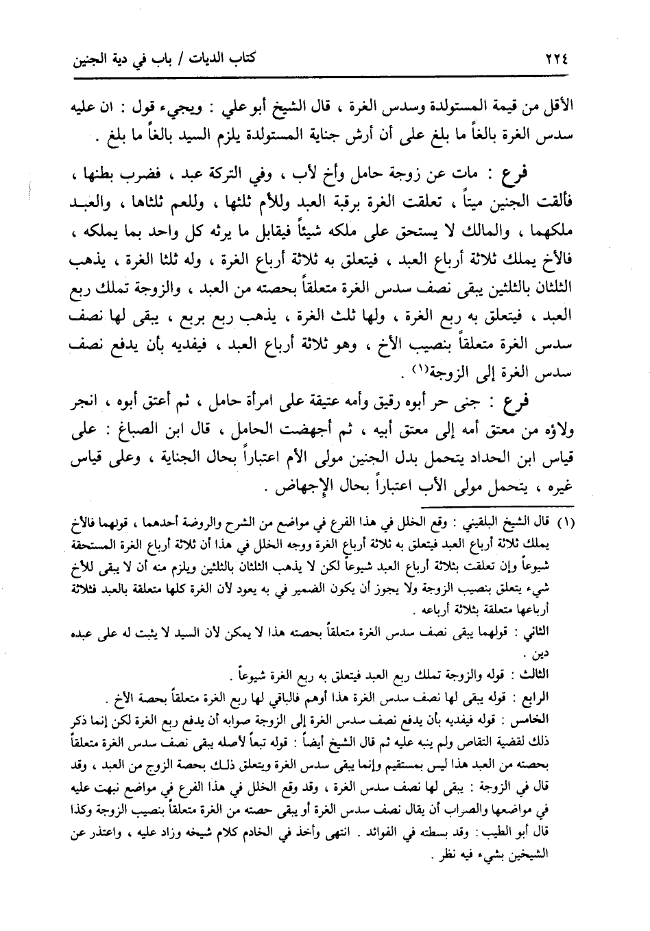 الاقل من قيمة المستولدة وسدس الغرة، قال الشيخ أبو علي: ويجئ قول: إن عليه سدس الغرة بالغا ما بلغ على أن أرش جناية المستولدة يلزم السيد بالغا ما بلغ. فرع مات عن زوجة حامل وأخ لاب، وفي التركة عبد، فضرب بطنها، فألقت الجنين ميتا، تعلقت الغرة برقبة العبد وللام ثلثها، وللعم ثلثاها، والعبد ملكهما، والمالك لا يستحق على ملكه شيئا فيقابل ما يرثه كل واحد بما يملكه، فالاخ يملك ثلاثة أرباع العبد، فيتعلق به ثلاثة أرباع الغرة، وله ثلثا الغرة، يذهب الثلثان بالثلثين يبقى نصف سدس الغرة متعلقا بحصته من العبد، والزوجة تملك ربع العبد، فيتعلق به ربع الغرة، ولها ثلث الغرة، يذهب ربع بربع، يبقى لها نصف سدس الغرة متعلقا بنصيب الاخ، وهو ثلاثة أرباع العبد، فيفديه بأن يدفع نصف سدس الغرة إلى الزوجة. فرع جنى حر أبوه رقيق وأمه عتيقة على امرأة حامل، ثم أعتق أبوه، انجر ولاؤه من معتق أمه إلى معتق أبيه، ثم أجهضت الحامل، قال ابن الصباغ: على قياس ابن الحداد يتحمل بدل الجنين مولى الام اعتبارا بحال فرع أحبل الجناية، وعلى قياس غيره، يتحمل مولى الاب اعتبارا بحال الاجهاض
