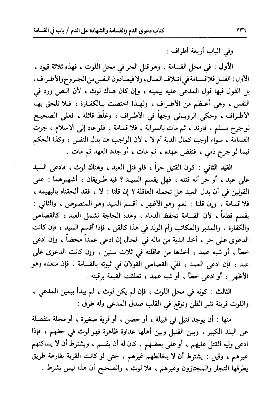 الأول : في محل القسامة، وهو قتل الحر في محل اللوث، فهذه ثلاثة قيود، الاول: القتل، فلا قسامة في إتلاف المال، ولا فيما دون النفس من الجروح والاطراف، بل القول فيها قول المدعى عليه بيمينه، وإن كان هناك لوث، لان النص ورد في النفس، وهي أعظم من الاطراف، ولهذا اختصت بالكفارة، فلا تلحق بها الاطراف، وحكى الروياني وجها في الاطراف، وغلط قائله، فعلى الصحيح لو جرح مسلم، فارتد، ثم مات بالسراية، فلا قسامة، فلو عاد إلى الاسلام، جرت القسامة، سواء أوجبنا كمال الدية أم لا، لان الواجب هنا بدل النفس، وكذا الحكم فيما لو جرح ذمي، فنقض عهده، ثم مات، أو جدد العهد ثم مات. القيد الثاني: كون القتيل حرا، فلو قتل العبد، وهناك لوث، فادعى السيد على عبد، أو حر أنه قتله، فهل يقسم السيد ؟ فيه طريقان، أشهرهما: على القولين في أن بدل العبد هل تحمله العاقلة ؟ إن قلنا: لا، فقد ألحقناه بالبهيمة، فلا قسامة، وإن قلنا: نعم وهو الاظهر، أقسم السيد وهو المنصوص، والثاني: يقسم قطعا، لان القسامة تحفظ الدماء، وهذه الحاجة تشمل العبد، كالقصاص والكفارة، والمدبر والمكاتب وأم الولد في هذا كالقن، فإذا أقسم السيد، فإن كانت الدعوى على حر، أخذ الدية من ماله في الحال إن ادعى عمدا محضا، وإن ادعى خطأ، أو شبه عمد، أخذها من عاقلته في ثلاث سنين، وإن كانت الدعوى على عبد، فإن ادعى العمد، ففي القصاص القولان في ثبوته بالقسامة، فإن منعناه وهو الاظهر، أو ادعى خطأ، أو شبه عمد، تعلقت القيمة برقبته. الثالث: كونه في محل اللوث، فإن لم يكن لوث، لم يبدأ بيمين المدعي، واللوث قرينة تثير الظن وتوقع في القلب صدق المدعي وله طرق: منها: أن يوجد قتيل في قبيلة، أو حصن، أو قرية صغيرة، أو محلة منفصلة عن البلد الكبير، وبين القتيل وبين أهلها عداوة ظاهرة فهو لوث في حقهم، فإذا ادعى وليه القتل عليهم، أو على بعضهم، كان له أن يقسم، ويشترط أن لا يساكنهم غيرهم، وقيل: يشترط أن لا يخالطهم غيرهم، حتى لو كانت القرية بقارعة طريق يطرقها التجار والمجتازون وغيرهم، فلا لوث، والصحيح أن هذا ليس بشرط.