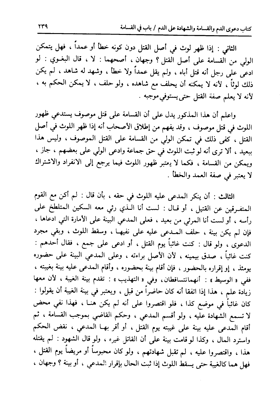 الثاني: إذا ظهر لوث في أصل القتل دون كونه خطأ أو عمدا، فهل يتمكن الولي من القسامة على أصل القتل ؟ وجهان، أصحهما: لا، قال البغوي: لو ادعى على رجل أنه قتل أباه، ولم يقل عمدا ولا خطأ، وشهد له شاهد، لم يكن ذلك لوثا، لانه لا يمكنه أن يحلف مع شاهده، ولو حلف، لا يمكن الحكم به، لانه لا يعلم صفة القتل حتى يستوفي موجبه. واعلم أن هذا المذكور يدل على أن القسامة على قتل موصوف يستدعي ظهور اللوث في قتل موصوف، وقد يفهم من إطلاق الاصحاب أنه إذا ظهر اللوث في أصل القتل، كفى ذلك في تمكن الولي من القسامة على القتل الموصوف، وليس هذا ببعيد، ألا ترى أنه لو ثبت اللوث في حق جماعة وادعى الولي على بعضهم، جاز، ويمكن من القسامة، فكما لا يعتبر ظهور اللوث فيما يرجع إلى الانفراد والاشتراك لا يعتبر في صفة العمد والخطأ. الثالث: أن ينكر المدعى عليه اللوث في حقه، بأن قال: لم أكن مع القوم المتفرقين عن القتيل، أو قال: لست أنا الذي رئي معه السكين المتلطخ على رأسه، أو لست أنا المرئي من بعيد، فعلى المدعي البينة على الامارة التي ادعاها، فإن لم يكن بينة، حلف المدعى عليه على نفيها، وسقط اللوث، وبقي مجرد الدعوى، ولو قال: كنت غائبا يوم القتل، أو ادعى على جمع، فقال أحدهم: كنت غائبا، صدق بيمينه، لان الاصل براءته، وعلى المدعي البينة على حضوره يومئذ، أو إقراره بالحضور، فإن أقام بينة بحضوره، وأقام المدعى عليه بينة بغيبته، ففي الوسيط: أنهما تتساقطان، وفي التهذيب: تقدم بينة الغيبة، لان معها زيادة علم، هذا إذا اتفقا أنه كان حاضرا من قبل، ويعتبر في بينة الغيبة أن يقولوا: كان غائبا في موضع كذا، فلو اقتصروا على أنه لم يكن هنا، فهذا نفي محض لا تسمع الشهادة عليه، ولو أقسم المدعي، وحكم القاضي بموجب القسامة، ثم أقام المدعى عليه بينة على غيبته يوم القتل، أو أقر بها المدعي، نقض الحكم واسترد المال، وكذا لو قامت بينة على أن القاتل غيره، ولو قال الشهود: لم يقتله هذا، واقتصروا عليه، لم تقبل شهادتهم، ولو كان محبوسا أو مريضا يوم القتل، فهل هما كالغيبة حتى يسقط اللوث إذا ثبت الحال بإقرار المدعي، أو بينة ؟ وجهان،