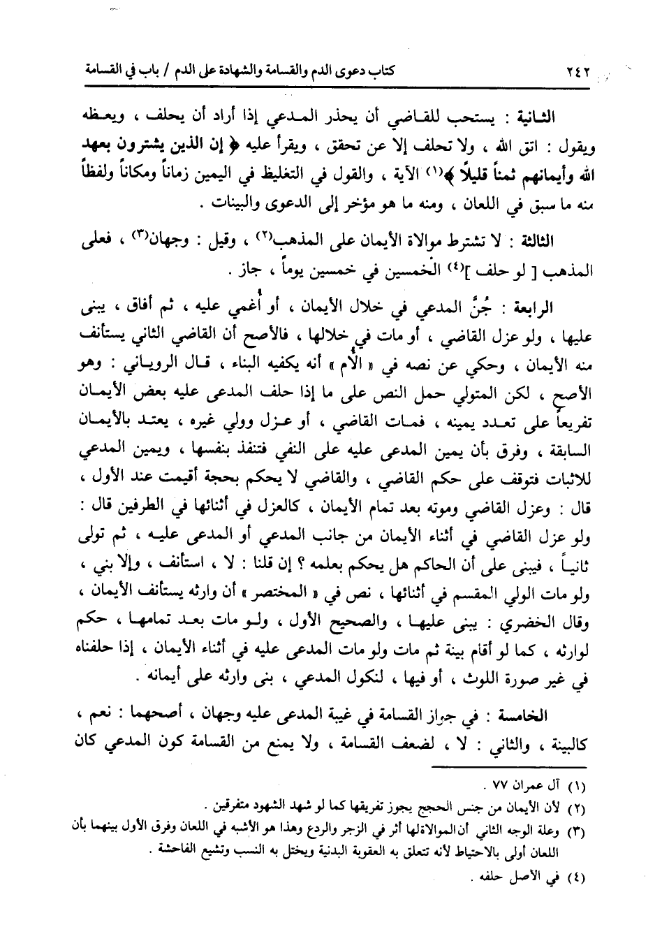 الثانية: يستحب للقاضي أن يحذر المدعي إذا أراد أن يحلف، ويعظه ويقول: اتق الله، ولا تحلف إلا عن تحقق، ويقرأ عليه * (إن الذين يشترون بعهد الله وأيمانهم ثمنا قليلا) *، والقول في التغليظ في اليمين زمانا ومكانا ولفظا منه ما سبق في اللعان، ومنه ما هو مؤخر إلى الدعوى والبينات. الثالثة: لا تشترط موالاة الايمان على المذهب، وقيل: وجهان، فعلى المذهب: لو حلف الخمسين في خمسين يوما، جاز. الرابعة: جن المدعي في خلال الايمان، أو أغمي عليه، ثم أفاق، يبنى عليها، ولو عزل القاضي، أو مات في خلالها، فالاصح أن القاضي الثاني يستأنف منه الايمان، وحكي عن نصه في الام أنه يكفيه البناء، قال الروياني: وهو الاصح، لكن المتولي حمل النص على ما إذا حلف المدعى عليه بعض الايمان تفريعا على تعدد يمينه، فمات القاضي، أو عزل وولي غيره، يعتد بالايمان السابقة، وفرق بأن يمين المدعى عليه على النفي فتنفذ بنفسها، ويمين المدعي للاثبات فتوقف على حكم القاضي، والقاضي لا يحكم بحجة أقيمت عند الاول، قال: وعزل القاضي وموته بعد تمام الايمان، كالعزل في أثنائها في الطرفين، قال: ولو عزل القاضي في أثناء الايمان من جانب المدعي أو المدعى عليه، ثم تولى ثانيا، فيبنى على أن الحاكم هل يحكم بعلمه ؟ إن قلنا: لا، استأنف، وإلا بنى، ولو مات الولي المقسم في أثنائها، نص في المختصر أن وارثه يستأنف الايمان، وقال الخضري: يبنى عليها، والصحيح الاول، ولو مات بعد تمامها، حكم لوارثه، كما لو أقام بينة ثم مات ولو مات المدعى عليه في أثناء الايمان، إذا حلفناه في غير صورة اللوث، أو فيها، لنكول المدعي، بنى وارثه على أيمانه. الخامسة: في جواز القسامة في غيبة المدعى عليه وجهان، أصحهما: نعم، كالبينة، والثاني: لا، لضعف القسامة، ولا يمنع من القسامة كون المدعي كان
