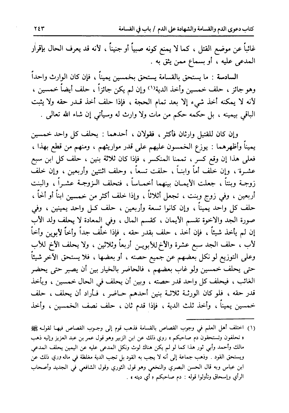 غائبا عن موضع القتل، كما لا يمنع كونه صبيا أو جنينا، لانه قد يعرف الحال بإقرار المدعى عليه، أو بسماع ممن يثق به. السادسة: ما يستحق بالقسامة يستحق بخمسين يمينا، فإن كان الوارث واحدا وهو جائز، حلف خمسين وأخذ الدية، وإن لم يكن جائزا، حلف أيضا خمسين، لانه لا يمكنه أخذ شئ إلا بعد تمام الحجة، فإذا حلف أخذ قدر حقه ولا يثبت الباقي بيمينه، بل حكمه حكم من مات ولا وارث له وسيأتي إن شاء الله تعالى، وإن كان للقتيل وارثان فأكثر، فقولان، أحدهما: يحلف كل واحد خمسين يمينا، وأظهرهما: يوزع الخمسون عليهم على قدر مواريثهم، ومنهم من قطع بهذا، فعلى هذا إن وقع كسر، تممنا المنكسر، فإذا كان ثلاثة بنين، حلف كل ابن سبع عشرة، وإن خلف أما وابنا، حلفت تسعا وحلف اثنتين وأربعين، وإن خلف زوجة وبنتا جعلت الايمان بينهما أخماسا، فتحلف الزوجة عشرا، والبنت أربعين، وفي زوج وبنت، تجعل أثلاثا، وإذا خلف أكثر من خمسين ابنا أو أخا، حلف كل واحد يمينا، وإن كانوا تسعة وأربعين، حلف كل واحد يمينين، وفي صورة الجد والاخوة تقسم الايمان، كقسم المال، وفي المعادة لا يحلف ولد الاب إن لم يأخذ شيئا، فإن أخذ، حلف بقدر حقه، فإذا خلف جدا وأخا لابوين وأخا لاب، حلف الجد سبع عشرة والاخ للابوين أربعا وثلاثين، ولا يحلف الاخ للاب وعلى التوزيع لو نكل بعضهم عن جميع حصته، أو بعضها، فلا يستحق الآخر شيئا حتى يحلف خمسين ولو غاب بعضهم، فالحاضر بالخيار بين أن يصبر حتى يحضر الغائب، فيحلف كل واحد قدر حصته، وبين أن يحلف في الحال خمسين، ويأخذ قدر حقه، فلو كان الورثة ثلاثة بنين أحدهم حاضر، فأراد أن يحلف، حلف خمسين يمينا، وأخذ ثلث الدية، فإذا قدم ثان، حلف نصف الخمسين، وأخذ