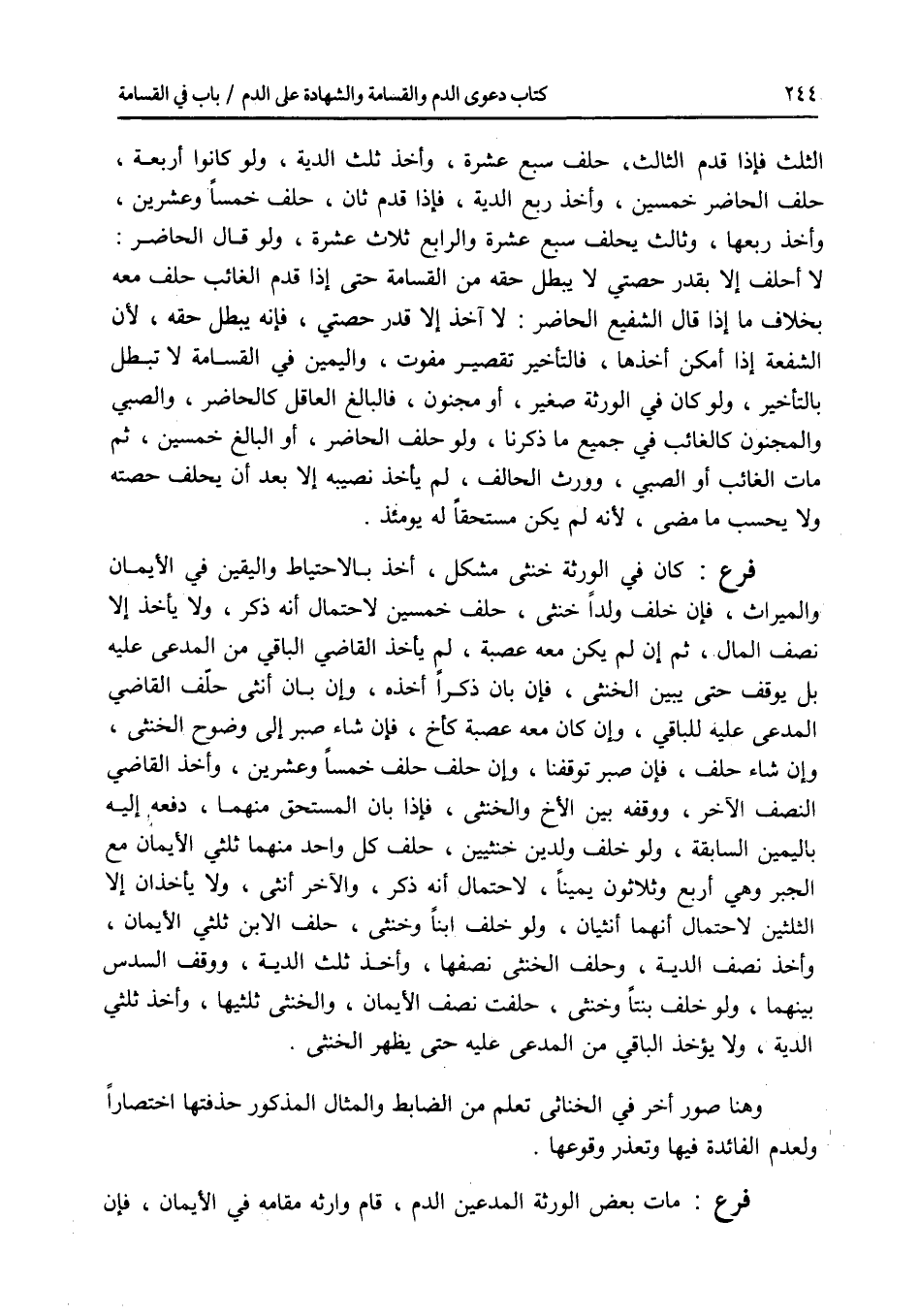 الثلث فإذا قدم الثالث، حلف سبع عشرة، وأخذ ثلث الدية، ولو كانوا أربعة، حلف الحاضر خمسين، وأخذ ربع الدية، فإذا قدم ثان، حلف خمسا وعشرين، وأخذ ربعها، وثالث يحلف سبع عشرة والرابع ثلاث عشرة، ولو قال الحاضر: لا أحلف إلا بقدر حصتي لا يبطل حقه من القسامة حتى إذا قدم الغائب حلف معه بخلاف ما إذا قال الشفيع الحاضر: لا آخذ إلا قدر حصتي، فإنه يبطل حقه، لان الشفعة إذا أمكن أخذها، فالتأخير تقصير مفوت، والمين في القسامة لا تبطل بالتأخير، ولو كان في الورثة صغير، أو مجنون، فالبالغ العاقن كالحاضر، والصبي والمجنون كالغائب في جميع ما ذكرناه، ولو حلف الحاضر، أو البالغ خمسين، ثم مات الغائب أو الصبي، وورث الحالف، لم يأخذ نصيبه إلا بعد أن يحلف حصته ولا يحسب ما مضى، لانه لم يكن مستحقا له يومئذ. فرع كان في الورثة خنثى مشكل، أخذ بالاحتياط واليقين في الايمان والميراث، فإن خلف ولدا خنثى، حلف خمسين لاحتمال أنه ذكر، ولا يأخذ إلا نصف المال، ثم إن لم يكن معه عصبة، لم يأخذ القاضي الباقي من المدعى عليه بل يوقف حتى يبين الخنثى، فإن بان ذكرا أخذه، وإن بان أنثى حلف القاضي المدعى عليه للباقي، وإن كان معه عصبة كأخ، فإن شاء صبر إلى وضوح الخنثى، وإن شاء حلف، فإن صبر توقفنا، وإن حلف حلف خمسا وعشرين، وأخذ القاضي النصف الآخر، ووقفه بين الاخ والخنثى، فإذا بان المستحق منهما، دفعه إليه باليمين السابقة، ولو خلف ولدين خنثيين، حلف كل واحد منهما ثلثي الايمان مع الجبر وهي أربع وثلاثون يمينا، لاحتمال أنه ذكر، والآخر أنثى، ولا يأخذان إلا الثلثين لاحتمال أنهما أنثيان، ولو خلف ابنا وخنثى، حلف الابن ثلثي الايمان، وأخذ نصف الدية، وحلف الخنثى نصفها، وأخذ ثلث الدية، ووقف السدس بينهما، ولو خلف بنتا وخنثى، حلفت نصف الايمان، والخنثى ثلثيها، وأخذ ثلثي الدية، ولا يؤخذ الباقي من المدعى عليه حتى يظهر الخنثى. وهنا صور أخر في الخناثى تعلم من الضابط والمثال المذكور حذفتها اختصارا ولعدم الفائدة فيها وتعذر وقوعها. فرع مات بعض الورثة المدعين الدم، قام وارثه مقامه في الايمان، فإن