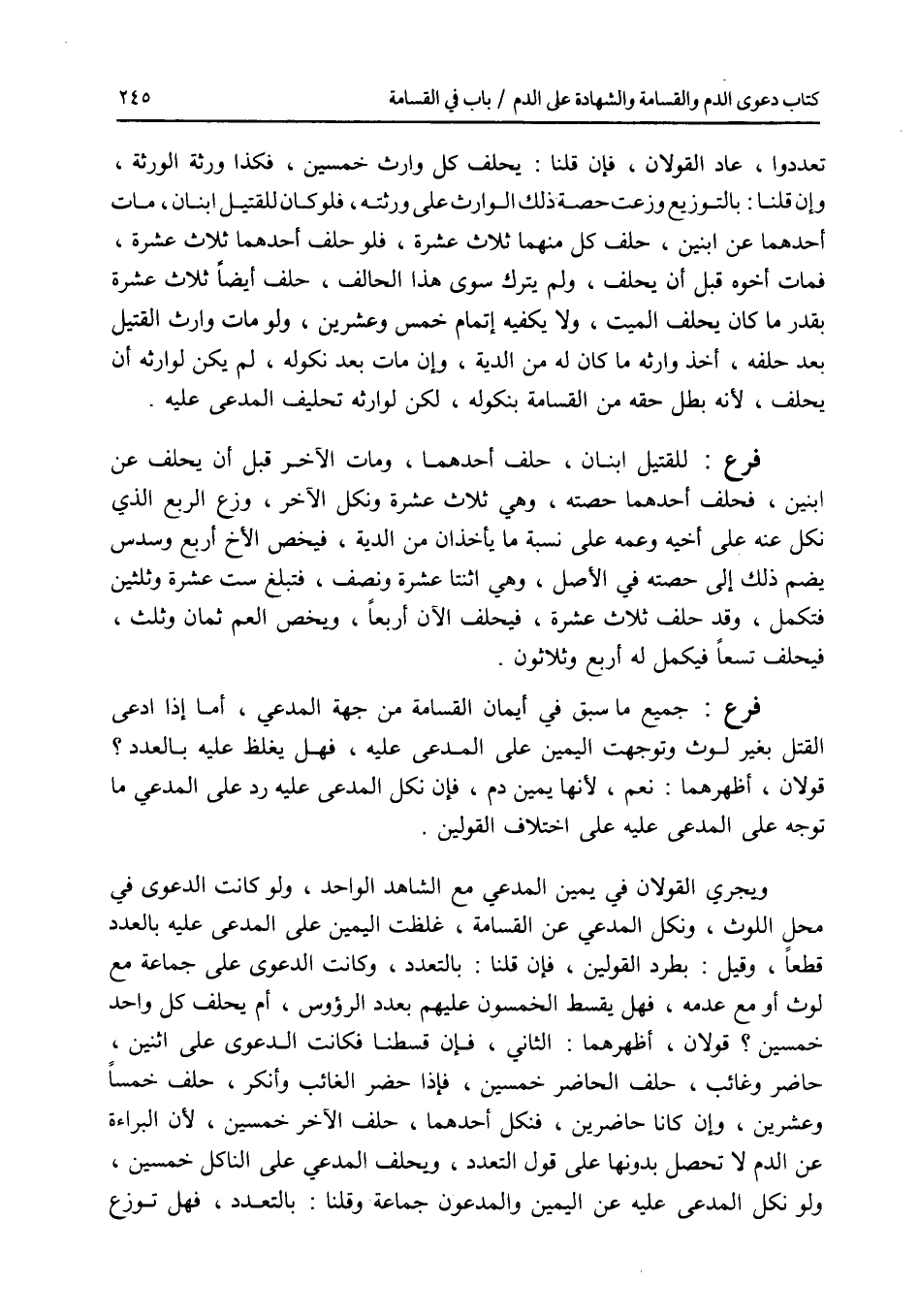 تعددوا، عاد القولان، فإن قلنا: يحلف كل وارث خمسين، فكذا ورثة الورثة، وإن قلنا: بالتوزيع، وزعت حصة ذلك الوارث على ورثته، فلو كان للقتيل ابنان، مات أحدهما عن ابنين، حلف كل منهما ثلاث عشرة، فلو حلف أحدهما ثلاث عشرة، فمات أخوه قبل أن يحلف، ولم يترك سوى هذا الحالف، حلف أيضا ثلاث عشرة بقدر ما كان يحلف الميت، ولا يكفيه إتمام خمس وعشرين، ولو مات وارث القتيل بعد حلفه، أخذ وارثه ما كان له من الدية، وإن مات بعد نكوله، لم يكن لوارثه أن يحلف، لانه بطل حقه من القسامة بنكوله، لكن لوارثه تحليف المدعى عليه. فرع للقتيل ابنان، حلف أحدهما، ومات الآخر قبل أن يحلف عن ابنين، فحلف أحدهما حصته، وهي ثلاث عشرة ونكل الآخر، وزع الربع الذي نكل عنه على أخيه وعمه على نسبة ما يأخذان من الدية، فيخص الاخ أربع وسدس يضم ذلك إلى حصته في الاصل، وهي اثنتا عشرة ونصف، فتبلغ ست عشرة وثلثين فتكمل، وقد حلف ثلاث عشرة، فيحلف الآن أربعا، ويخص العم ثمان وثلث، فيحلف تسعا فيكمل له أربع وثلاثون. فرع جميع ما سبق في أيمان القسامة من جهة المدعي، أما إذا ادعى القتل بغير لوث وتوجهت اليمين على المدعى عليه، فهل يغلظ عليه بالعدد ؟ قولان، أظهرهما: نعم، لانها يمين دم، فإن نكل المدعى عليه رد على المدعي ما توجه على المدعى عليه على اختلاف القولين. ويجري القولان في يمين المدعي مع الشاهد الواحد، ولو كانت الدعوى في محل اللوث، ونكل المدعي عن القسامة، غلظت اليمين على المدعى عليه بالعدد قطعا، وقيل: بطرد القولين، فإن قلنا: بالتعدد، وكانت الدعوى على جماعة مع لوث أو مع عدمه، فهل يقسط الخمسون عليهم بعدد الرؤوس، أم يحلف كل واحد خمسين ؟ قولان، أظهرهما: الثاني، فإن قسطنا فكانت الدعوى على اثنين، حاضر وغائب، حلف الحاضر خمسين، فإذا حضر الغائب وأنكر، حلف خمسا وعشرين، وإن كانا حاضرين، فنكل أحدهما، حلف الآخر خمسين، لان البراءة عن الدم لا تحصل بدونها على قول التعدد، ويحلف المدعي على الناكل خمسين، ولو نكل المدعى عليه عن اليمين والمدعون جماعة وقلنا: بالتعدد، فهل توزع