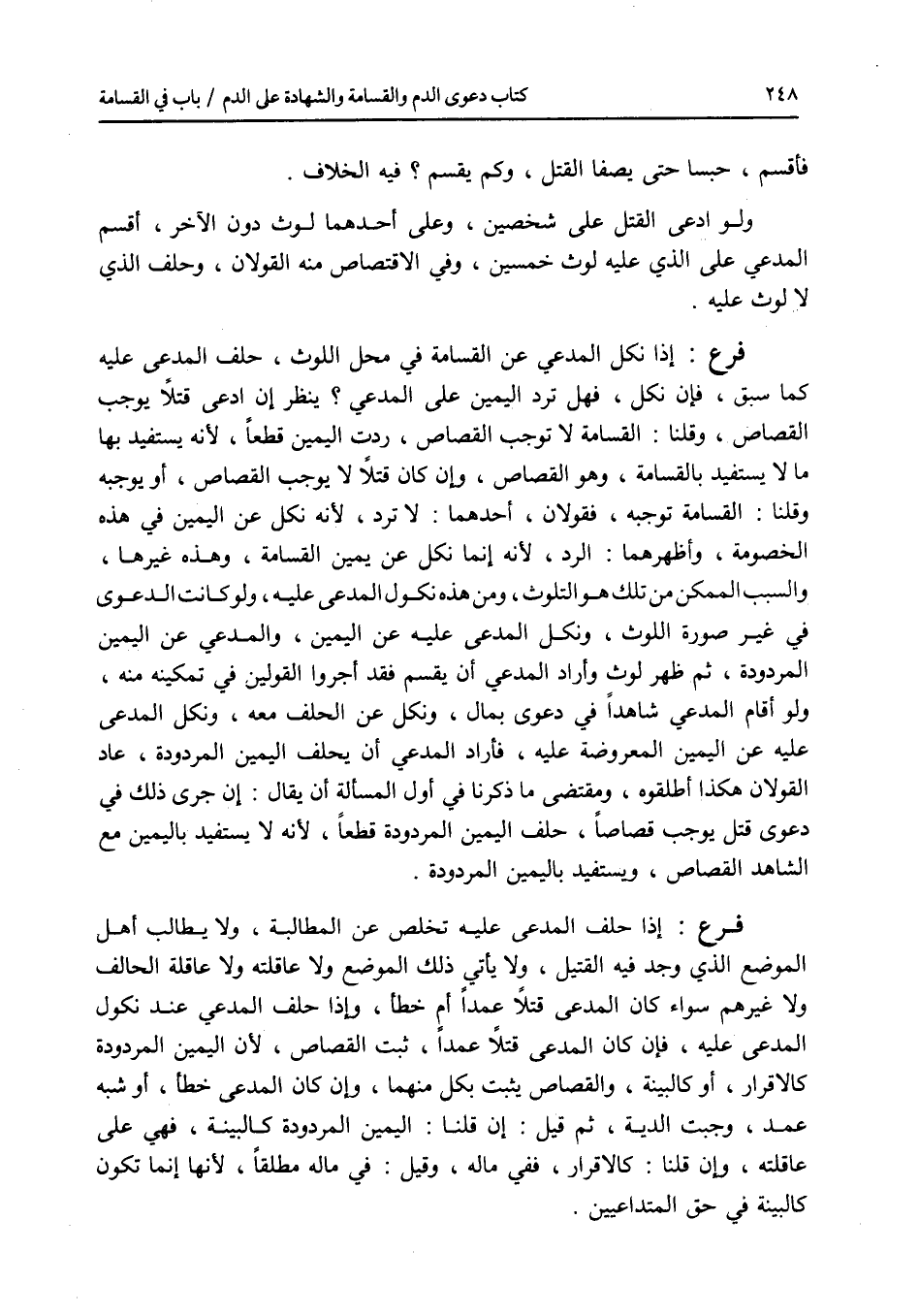 فأقسم، حبسا حتى يصفا القتل، وكم يقسم ؟ فيه الخلاف، ولو ادعى القتل على شخصين، وعلى أحدهما لوث دون الآخر، أقسم المدعي على الذي عليه لوث خمسين، وفي الاقتصاص منه القولان، وحلفالذي لا لوث عليه. فرع إذا نكل المدعي عن القسامة في محل اللوث، حلف المدعى عليه كما سبق، فإن نكل، فهل ترد اليمين على المدعي ؟ ينظر إن ادعى قتلا يوجب القصاص، وقلنا: القسامة لا توجب القصاص، ردت اليمين قطعا، لانه يستفيد بها ما لا يستفيد بالقسامة، وهو القصاص، وإن كان قتلا لا يوجب القصاص، أو يوجبه وقلنا: القسامة توجبه، فقولان، أحدهما: لا ترد، لانه نكل عن اليمين في هذه الخصومة، وأظهرهما: الرد، لانه إنما نكل عن يمين القسامة، وهذه غيرها، والسبب الممكن من تلك هو اللوث، ومن هذه نكول المدعى عليه، ولو كانت الدعوى في غير صورة اللوث، ونكل المدعى عليه عن اليمين، والمدعي عن اليمين المردودة، ثم ظهر لوث وأراد المدعي أن يقسم فقد أجروا القولين في تمكينه منه، ولو أقام المدعي شاهدا في دعوى بمال، ونكل عن الحلف معه، ونكل المدعى عليه عن اليمين المعروضة عليه، فأراد المدعي أن يحلف اليمين المردودة، عاد القولان هكذا أطلقوه، ومقتضى ما ذكرنا في أول المسألة أن يقال: إن جرى ذلك في دعوى قتل يوجب قصاصا، حلف اليمين المردودة قطعا، لانه لا يستفيد باليمين مع الشاهد القصاص، ويستفيد باليمين المردودة. فرع إذا حلف المدعى عليه تخلص عن المطالبة، ولا يطالب أهل الموضع الذي وجد فيه القتيل، ولا يأتي ذلك الموضع ولا عاقلته ولا عاقلة الحالف ولا غيرهم سواء كان المدعى قتلا عمدا أم خطأ، وإذا حلف المدعي عند نكول المدعى عليه، فإن كان المدعى قتلا عمدا، ثبت القصاص، لان اليمين المردودة كالاقرار، أو كالبينة، والقصاص يثبت بكل منهما، وإن كان المدعى خطأ، أو شبه عمد، وجبت الدية، ثم قيل: إن قلنا: اليمين المردودة كالبينة، فهي على عاقلته، وإن قلنا: كالاقرار، ففي ماله، وقيل: في ماله مطلقا، لانها إنما تكون كالبينة في حق المتداعيين.