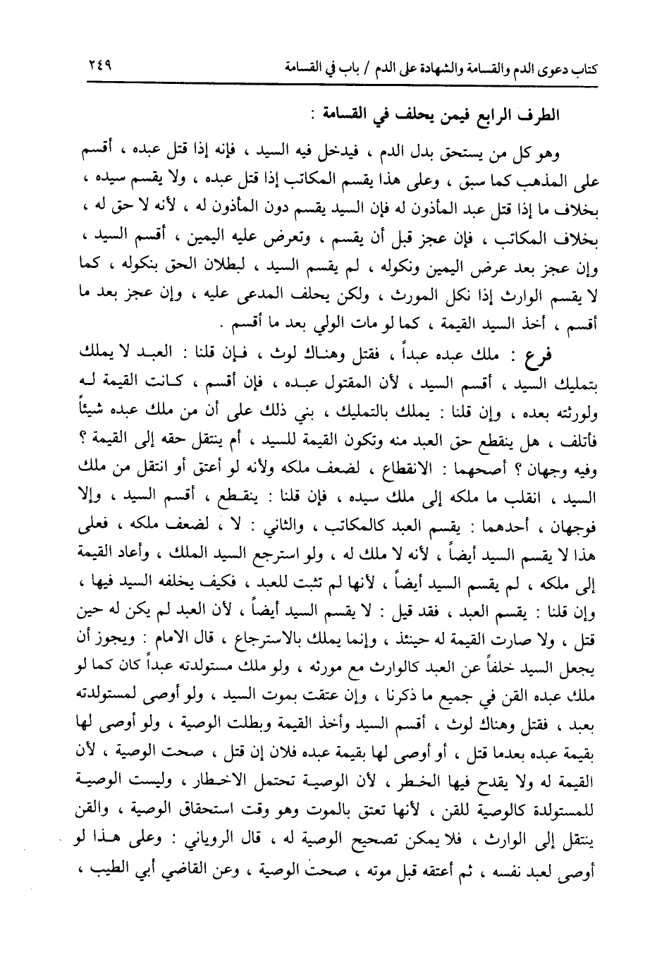 الطرف الرابع : فيمن يحلف في القسامة وهو كل من يستحق بدل الدم، فيدخل فيه السيد، فإنه إذا قتل عبده، أقسم على المذهب كما سبق، وعلى هذا يقسم المكاتب إذا قتل عبده، ولا يقسم سيده، بخلاف ما إذا قتل عبد المأذون له فإن السيد يقسم دون المأذون له، لانه لا حق له، بخلاف المكاتب، فإن عجز قبل أن يقسم، وتعرض عليه اليمين، أقسم السيد، وإن عجز بعد عرض اليمين ونكوله، لم يقسم السيد، لبطلان الحق بنكوله، كما لا يقسم الوارث إذا نكل المورث، ولكن يحلف المدعى عليه، وإن عجز بعد ما أقسم، أخذ السيد القيمة، كما لو مات الولي بعد ما أقسم. فرع ملك عبده عبدا، فقتل وهناك لوث، فإن قلنا: العبد لا يملك بتمليك السيد، أقسم السيد، لان المقتول عبده، فإن أقسم، كانت القيمة له ولورثته بعده، وإن قلنا: يملك بالتمليك، بني ذلك على أن من ملك عبده شيئا فأتلف، هل ينقطع حق العبد منه وتكون القيمة للسيد، أم ينتقل حقه إلى القيمة ؟ وفيه وجهان، أصحهما: الانقطاع، لضعف ملكه ولانه لو أعتق أو انتقل من ملك السيد، انقلب ما ملكه إلى ملك سيده، فإن قلنا: ينقطع، أقسم السيد، وإلا فوجهان، أحدهما: يقسم العبد كالمكاتب، والثاني: لا، لضعف ملكه، فعلى هذا لا يقسم السيد أيضا، لانه لا ملك له، ولو استرجع السيد الملك، وأعاد القيمة إلى ملكه، لم يقسم السيد أيضا، لانها لم تثبت للعبد، فكيف يخلفه السيد فيها، وإن قلنا: يقسم العبد، فقد قيل: لا يقسم السيد أيضا، لان العبد لم يكن له حين قتل، ولا صارت القيمة له حينئذ، وإنما يملك بالاسترجاع، قال الامام: ويجوز أن يجعل السيد خلفا عن العبد كالوارث مع مورثه، ولو ملك مستولدته عبدا كان كما لو ملك عبده القن في جميع ما ذكرنا، وإن عتقت بموت السيد، ولو أوصى لمستولدته بعبد، فقتل وهناك لوث، أقسم السيد وأخذ القيمة وبطلت الوصية، ولو أوصى لها بقيمة عبده بعدما قتل، أو أوصى لها بقيمة عبده فلان إن قتل، صحت الوصية، لان القيمة له ولا يقدح فيها الخطر، لان الوصية تحتمل الاخطار، وليست الوصية للمستولدة كالوصية للقن، لانها تعتق بالموت وهو وقت استحقاق الوصية، والقن ينتقل إلى الوارث، فلا يمكن تصحيح الوصية له، قال الروياني: وعلى هذا لو أوصى لعبد نفسه، ثم أعتقه قبل موته، صحت الوصية، وعن القاضي أبي الطيب،