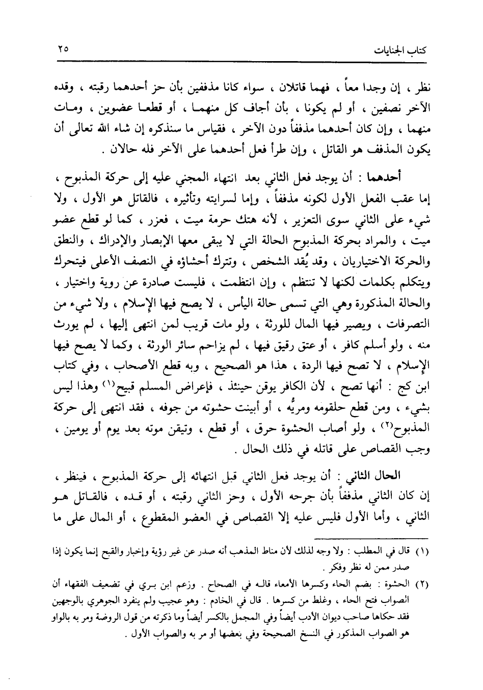نظر، إن وجدا معا، فهما قاتلان، سواء كانا مذففين بأن حز أحدهما رقبته، وقده الآخر نصفين، أو لم يكونا، بأن أجاف كل منهما، أو قطعا عضوين، ومات منهما، وإن كان أحدهما مذففا دون الآخر، فقياس ما سنذكره إن شاء الله تعالى أن يكون المذفف هو القاتل، وإن طرأ فعل أحدهما على الآخر فله حالان. أحدهما: أن يوجد فعل الثاني بعد انتهاء المجني عليه إلى حركة المذبوح، إما عقب الفعل الاول لكونه مذففا، وإما لسرايته وتأثيره، فالقاتل هو الاول، ولا شئ على الثاني سوى التعزير، لانه هتك حرمة ميت، فعزر، كما لو قطع عضو ميت، والمراد بحركة المذبوح الحالة التي لا يبقى معها الابصار والادراك، والنطق والحركة الاختياريان، وقد يقد الشخص، وتترك أحشاؤه في النصف الاعلى فيتحرك ويتكلم بكلمات لكنها لا تنتظم، وإن انتظمت، فليست صادرة عن روية واختيار، والحالة المذكورة وهي التي تسمى حالة اليأس، لا يصح فيها الاسلام، ولا شئ من التصرفات، ويصير فيها المال للورثة، ولو مات قريب لمن انتهى إليها، لم يورث منه، ولو أسلم كافر، أو عتق رقيق فيها، لم يزاحم سائر الورثة، وكما لا يصح فيها الاسلام، لا تصح فيها الردة، هذا هو الصحيح، وبه قطع الاصحاب، وفي كتاب ابن كج: أنها تصح، لان الكافر يوقن حينئذ، فإعراض المسلم قبيح، وهذا ليس بشئ، ومن قطع حلقومه ومريه، أو أبينت حشوته من جوفه، فقد انتهى إلى حركة المذبوح، ولو أصاب الحشوة حرق، أو قطع، وتيقن موته بعد يوم أو يومين، وجب القصاص على قاتله في ذلك الحال. الحال الثاني: أن يوجد فعل الثاني قبل انتهائه إلى حركة المذبوح، فينظر، إن كان الثاني مذففا بأن جرحه الاول، وحز الثاني رقبته، أو قده، فالقاتل هو الثاني، وأما الاول فليس عليه إلا القصاص في العضو المقطوع، أو المال على ما