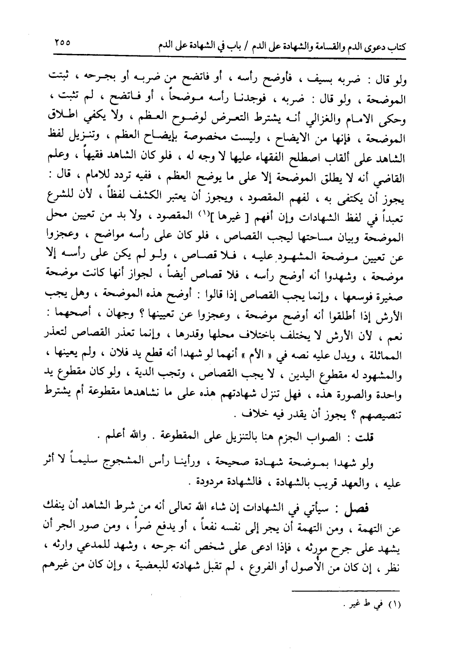 ولو قال: ضربه بسيف، فأوضح رأسه، أو فاتضح من ضربه أو بجرحه، ثبتت الموضحة، ولو قال: ضربه، فوجدنا رأسه موضحا، أو فاتضح، لم تثبت، وحكى الامام والغزالي أنه يشترط التعرض لوضوح العظم، ولا يكفي إطلاق الموضحة، فإنها من الايضاح، وليست مخصوصة بإيضاح العظم، وتنزيل لفظ الشاهد على ألقاب اصطلح الفقهاء عليها لا وجه له، فلو كان الشاهد فقيها، وعلم القاضي أنه لا يطلق الموضحة إلا على ما يوضح العظم، ففيه تردد للامام، قال: يجوز أن يكتفى به، لفهم المقصود، ويجوز أن يعتبر الكشف لفظا، لان للشرع تعبدا في لفظ الشهادات وإن أفهم غيرها المقصود، ولا بد من تعيين محل الموضحة وبيان مساحتها ليجب القصاص، فلو كان على رأسه مواضح، وعجزوا عن تعيين موضحة المشهود عليه، فلا قصاص، ولو لم يكن على رأسه إلا موضحة، وشهدوا أنه أوضح رأسه، فلا قصاص أيضا، لجواز أنها كانت موضحة صغيرة فوسعها، وإنما يجب القصاص إذا قالوا: أوضح هذه الموضحة، وهل يجب الارش إذا أطلقوا أنه أوضح موضحة، وعجزوا عن تعيينها ؟ وجهان، أصحهما: نعم، لان الارش لا يختلف باختلاف محلها وقدرها، وإنما تعذر القصاص لتعذر المماثلة، ويدل عليه نصه في الام أنهما لو شهدا أنه قطع يد فلان، ولم يعينها، والمشهود له مقطوع اليدين، لا يجب القصاص، وتجب الدية، ولو كان مقطوع يد واحدة والصورة هذه، فهل تنزل شهادتهم هذه على ما نشاهدها مقطوعة أم يشترط تنصيصهم ؟ يجوز أن يقدر فيه خلاف. قلت: الصواب الجزم هنا بالتنزيل على المقطوعة. والله أعلم. ولو شهدا بموضحة شهادة صحيحة، ورأينا رأس المشجوج سليما لا أثر عليه، والعهد قريب بالشهادة، فالشهادة مردودة. فصل سيأتي في الشهاددت إن شاء الله تعالى أنه من شرط الشاهد أن ينفك عن التهمة، ومن التهمة أن يجر إلى نفسه نفعا، أو يدفع ضرا، ومن صور الجر أن يشهد على جرح مورثه، فإذا ادعى على شخص أنه جرحه، وشهد للمدعي وارثه، نظر، إن كان من الاصول أو الفروع، لم تقبل شهادته للبعضية، وإن كان من غيرهم