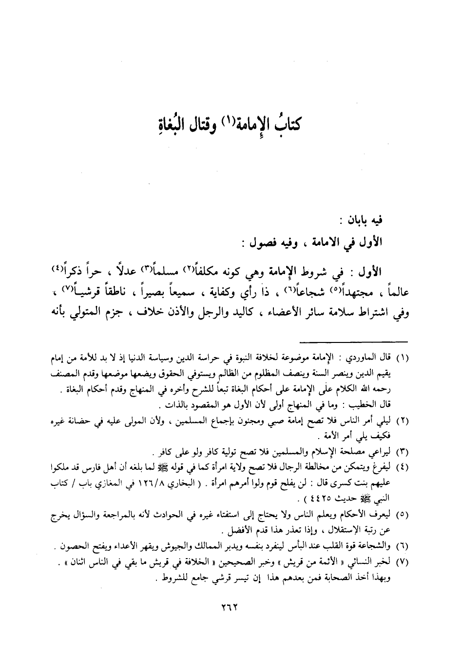 الأول : في شروط الامامة وهي كونه مكلفا مسلما عدلا، حرا ذكرا عالما، مجتهدا شجاعا، ذا رأي وكفاية، سميعا بعيدا، ناطقا قرشيا، في اشتراط سلامة سائر الاعضاء، كاليد والرجل والاذن خلاف، جزم المتولي بأنه